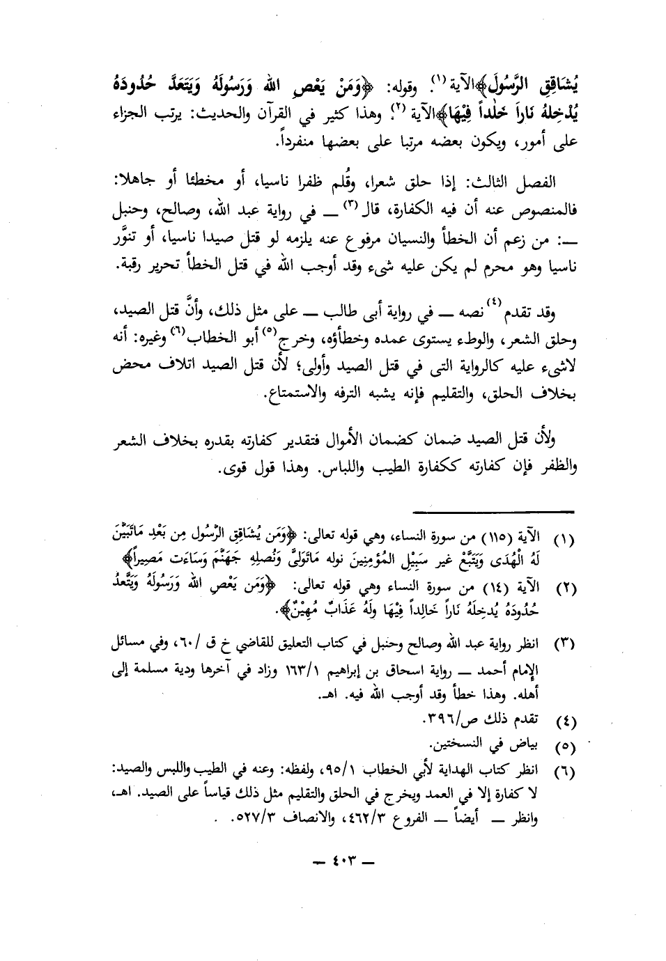 وَقَدْ تَقَدَّمَ نَصُّهُ - فِي رِوَايَةِ أَبِي طَالِبٍ - عَلَى مِثْلِ ذَلِكَ، وَأَنَّ قَتْلَ الصَّيْدِ، وَحَلْقَ الشَّعْرِ، وَالْوَطْءَ يَسْتَوِي عَمْدُهُ وَخَطَؤُهُ، وَخَرَّجَ أَبُو الْخَطَّابِ وَغَيْرُهُ: أَنَّهُ لَا شَيْءَ عَلَيْهِ كَالرِّوَايَةِ الَّتِي فِي قَتْلِ الصَّيْدِ وَأَوْلَى، لِأَنَّ قَتْلَ الصَّيْدِ إِتْلَافٌ مَحْضٌ بِخِلَافِ الْحَلْقِ، وَالتَّقْلِيمِ فَإِنَّهُ يُشْبِهُ التَّرَفُّهَ وَالِاسْتِمْتَاعَ.
