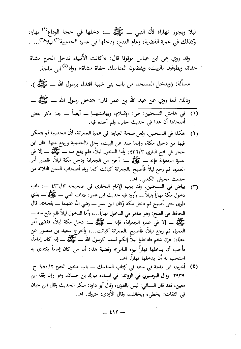 لَيْلًا، وَيَجُوزُ نَهَارًا؛ لِأَنَّ النَّبِيَّ - صَلَّى اللَّهُ عَلَيْهِ وَسَلَّمَ - دَخَلَهَا فِي حَجَّةِ الْوَدَاعِ نَهَارًا، وَكَذَلِكَ فِي عُمْرَةِ الْقَضِيَّةِ، وَعَامَ الْفَتْحِ، وَدَخَلَهَا فِي عُمْرَةِ الْحُدَيْبِيَةِ لَيْلًا .. . .