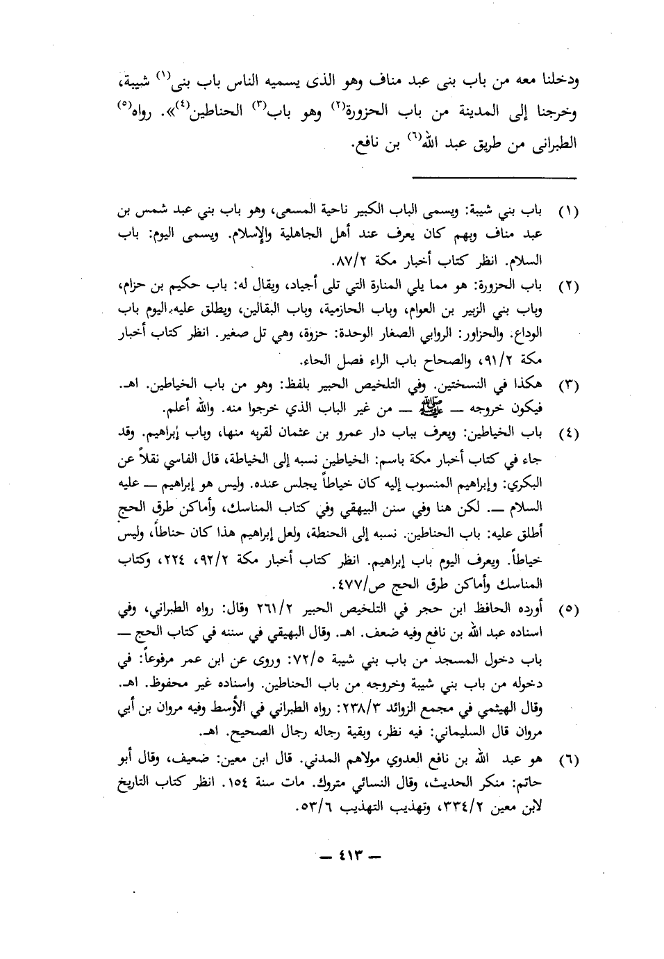 وَدَخَلْنَا مَعَهُ مِنْ بَابِ بَنِي عَبْدِ مَنَافٍ وَهُوَ الَّذِي يُسَمِّيهِ النَّاسُ بَابَ بَنِي شَيْبَةَ، وَخَرَجْنَا إِلَى الْمَدِينَةِ مِنْ بَابِ الْحَزْوَرَةِ، وَهُوَ بَابُ الْحَنَّاطِينَ» ". رَوَاهُ الطَّبَرَانِيُّ مِنْ طَرِيقِ عَبْدِ اللَّهِ بْنِ نَافِعٍ.