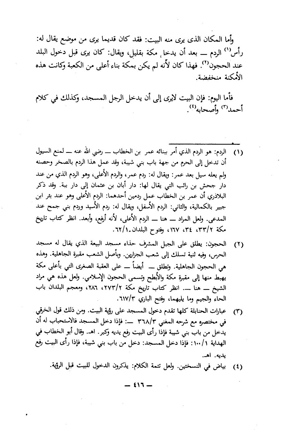 وَأَمَّا الْمَكَانُ الَّذِي يُرَى مِنْهُ الْبَيْتُ: فَقَدْ كَانَ قَدِيمًا يُرَى مِنْ مَوْضِعٍ يُقَالُ: لَهُ رَأْسُ الرَّدْمِ - بَعْدَ أَنْ يُدْخَلَ مَكَّةَ بِقَلِيلٍ، وَيُقَالَ: كَانَ يُرَى قَبْلَ دُخُولِ الْبَلَدِ عِنْدَ الْحُجُونِ. فَهَذَا كَانَ؛ لِأَنَّهُ لَمْ يَكُنْ بِمَكَّةَ بِنَاءٌ أَعْلَى مِنَ الْكَعْبَةِ وَكَانَتْ هَذِهِ الْأَمْكِنَةُ مُنْخَفِضَةً.