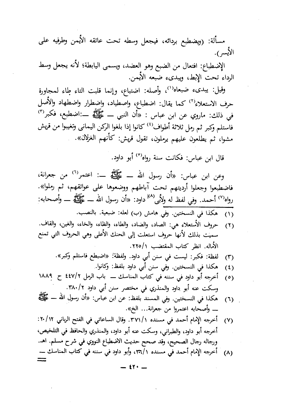 وَعَنِ ابْنِ عَبَّاسٍ: («أَنَّ رَسُولَ اللَّهِ - صَلَّى اللَّهُ عَلَيْهِ وَسَلَّمَ -: اعْتَمَرَ مِنْ جِعِرَّانَةَ، فَاضْطَبَعُوا وَجَعَلُوا أَرْدِيَتَهُمْ تَحْتَ آبَاطِهِمْ وَوَضَعُوهَا عَلَى عَوَاتِقِهِمْ، ثُمَّ رَمَلُوا»). رَوَاهُ أَحْمَدُ، وَفِي لَفْظٍ لَهُ، وَلِأَبِي دَاوُدَ: («أَنَّ رَسُولَ اللَّهِ - صَلَّى اللَّهُ عَلَيْهِ وَسَلَّمَ وَأَصْحَابَهُ: