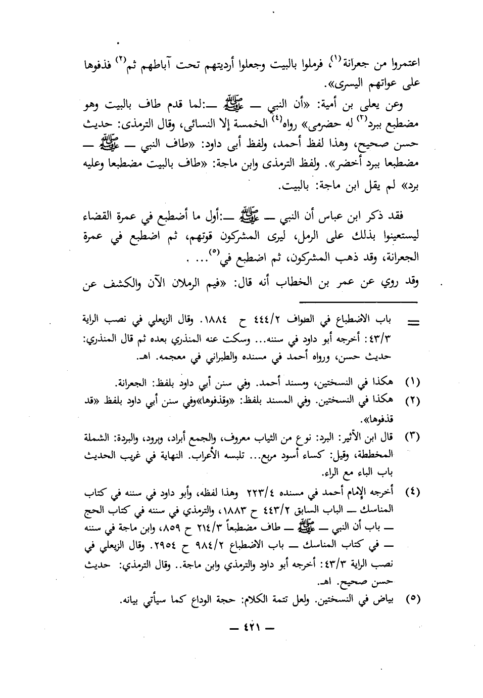 وَعَنْ يَعْلَى بْنِ أُمَيَّةَ: («أَنَّ النَّبِيَّ - صَلَّى اللَّهُ عَلَيْهِ وَسَلَّمَ -: لَمَّا قَدِمَ طَافَ بِالْبَيْتِ وَهُوَ مُضْطَبِعٌ بِبُرْدٍ لَهُ حَضْرَمِيٍّ»). رَوَاهُ الْخَمْسَةُ إِلَّا النَّسَائِيَّ، وَقَالَ التِّرْمِذِيُّ: حَدِيثٌ حَسَنٌ صَحِيحٌ، وَهَذَا لَفْظُ أَحْمَدَ، وَلَفْظُ أَبِي دَاوُدَ: («طَافَ النَّبِيُّ - صَلَّى اللَّهُ عَلَيْهِ وَسَلَّمَ - مُضْطَبِعًا بِبُرَدٍ أَخْضَرَ») وَلَفْظُ التِّرْمِذِيِّ، وَابْنِ مَاجَهْ: («طَافَ بِالْبَيْتِ مُضْطَبِعًا وَعَلَيْهِ بُرْدٌ») لَمْ يَقُلِ ابْنُ مَاجَهْ: بِالْبَيْتِ.