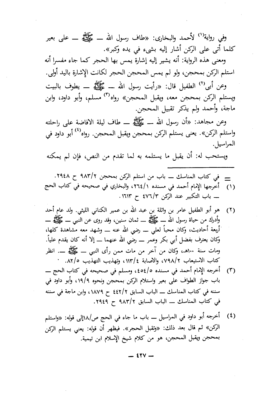 وَعَنْ أَبِي الطُّفَيْلِ قَالَ: («رَأَيْتُ رَسُولَ اللَّهِ - صَلَّى اللَّهُ عَلَيْهِ وَسَلَّمَ - يَطُوفُ بِالْبَيْتِ وَيَسْتَلِمُ الرُّكْنَ بِمِحْجَنٍ مَعَهُ، وَيُقَبِّلُ الْمِحْجَنَ»). رَوَاهُ مُسْلِمٌ، وَأَبُو دَاوُدَ، وَابْنُ مَاجَهْ، وَأَحْمَدُ وَلَمْ يَذْكُرْ تَقْبِيلَ الْمِحْجَنِ.