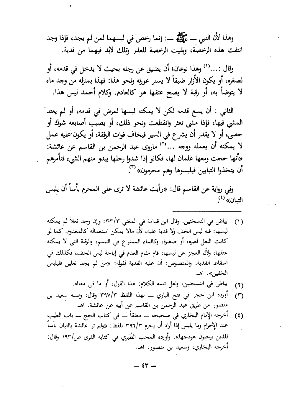 الثَّانِي: أَنْ يَسَعَ قَدَمَهُ لَكِنْ لَا يُمْكِنُهُ لُبْسُهَا لِمَرَضٍ فِي قَدَمِهِ، أَوْ لَمْ يَعْتَدِ الْمَشْيَ فِيهَا، فَإِذَا مَشَى تَعَثَّرَ وَانْقَطَعَتْ وَنَحْوُ ذَلِكَ، أَوْ يُصِيبُ أَصَابِعَهُ شَوْكٌ أَوْ حَصًى، أَوْ لَا يَقْدِرُ أَنْ يَشْرَعَ فِي السَّيْرِ فَيَخَافُ فَوَاتَ الرُّفْقَةِ، أَوْ يَكُونُ عَلَيْهِ عَمَلٌ لَا يُمْكِنُهُ أَنْ يَعْمَلَهُ وَوَجْهُ. . . مَا رَوَى عَبْدُ الرَّحْمَنِ بْنُ الْقَاسِمِ، عَنْ عَائِشَةَ: "أَنَّهَا حَجَّتْ وَمَعَهَا غِلْمَانٌ لَهَا، فَكَانُوا إِذَا شَدُّوا رَحْلَهَا يَبْدُو مِنْهُمُ الشَّيْءُ فَتَأْمُرُهُمْ أَنْ يَتَّخِذُوا التَّبَابِينَ فَيَلْبَسُوهَا وَهُمْ مُحْرِمُونَ ".
