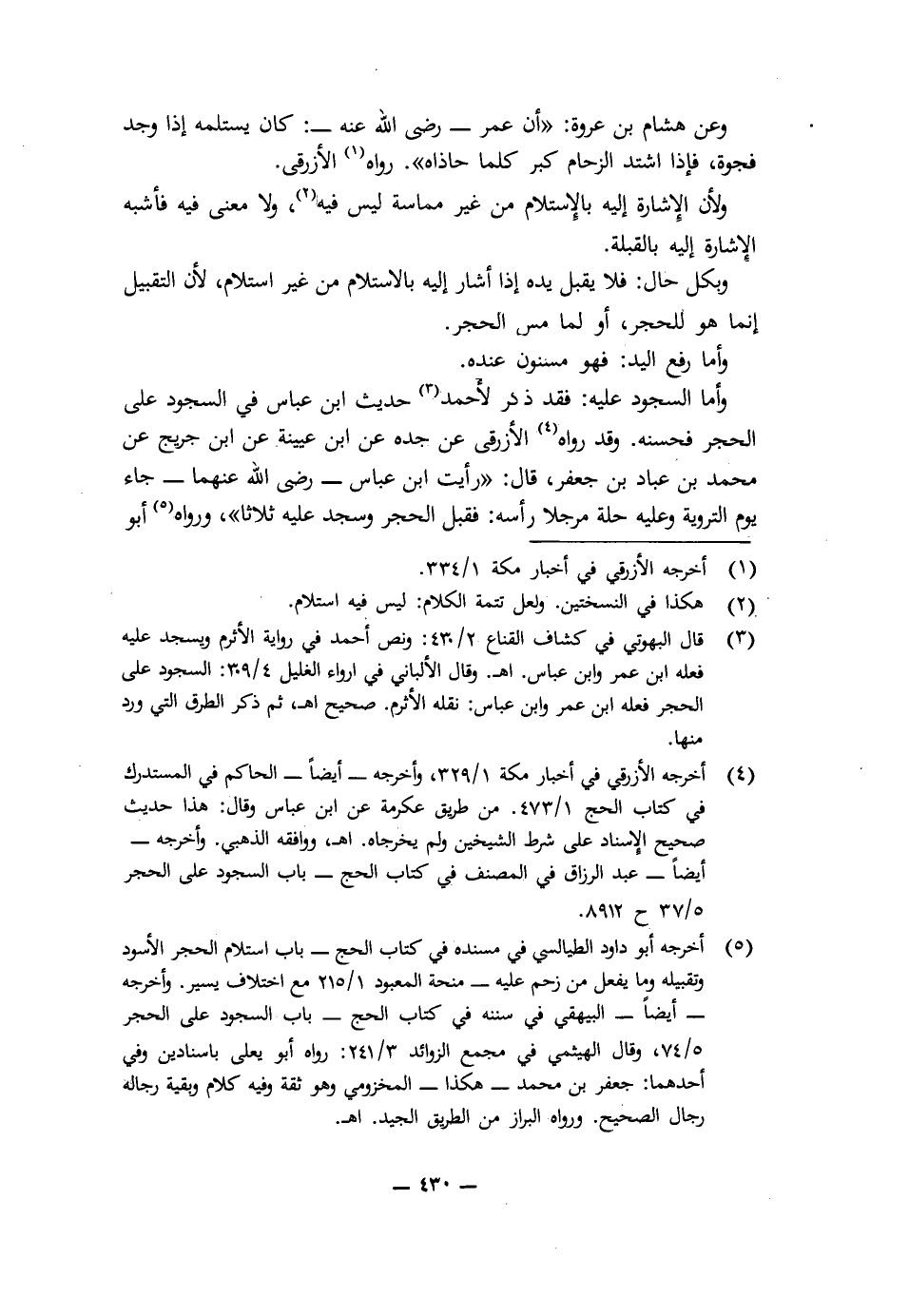 وَأَمَّا السُّجُودُ عَلَيْهِ: فَقَدْ ذَكَرَ لِأَحْمَدَ حَدِيثَ ابْنِ عَبَّاسٍ فِي السُّجُودِ عَلَى الْحَجَرِ فَحَسَّنَهُ. وَقَدْ رَوَاهُ الْأَزْرَقِيُّ، عَنْ جَدِّهِ، عَنِ ابْنِ عُيَيْنَةَ، عَنِ ابْنِ جُرَيْجٍ، عَنْ مُحَمَّدِ بْنِ عَبَّادِ بْنِ جَعْفَرٍ، قَالَ: («رَأَيْتُ ابْنَ عَبَّاسٍ - رَضِيَ اللَّهُ عَنْهُمَا - جَاءَ يَوْمَ التَّرْوِيَةِ وَعَلَيْهِ حُلَّةٌ مُرَجِّلًا رَأْسَهُ: فَقَبَّلَ الْحَجَرَ وَسَجَدَ عَلَيْهِ ثَلَاثًا»). وَرَوَاهُ أَبُو