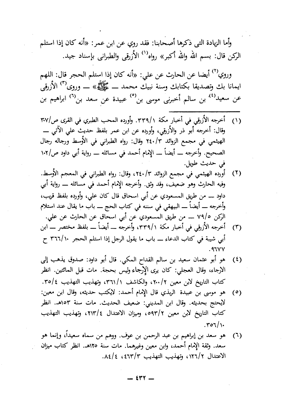 وَرُوِيَ أَيْضًا عَنِ الْحَارِثِ، عَنْ عَلِيٍّ: (أَنَّهُ كَانَ إِذَا اسْتَلَمَ الْحَجَرَ قَالَ: اللَّهُمَّ إِيمَانًا بِكَ، وَتَصْدِيقًا بِكِتَابِكَ وَسُنَّةِ نَبِيِّكَ مُحَمَّدٍ - صَلَّى اللَّهُ عَلَيْهِ وَسَلَّمَ -)، وَرَوَى الْأَزْرَقِيُّ عَنْ سَعِيدِ بْنِ سَالِمٍ، أَخْبَرَنِي مُوسَى بْنُ عُبَيْدَةَ عَنْ سَعْدِ بْنِ إِبْرَاهِيمَ بْنِ