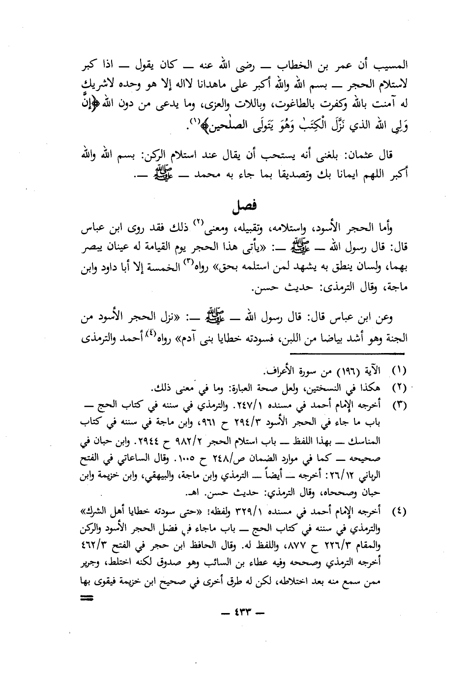 وَأَمَّا الْحَجَرُ الْأَسْوَدُ، وَاسْتِلَامُهُ، وَتَقْبِيلُهُ، وَمَعْنَى ذَلِكَ فَقَدْ رَوَى ابْنُ عَبَّاسٍ قَالَ: قَالَ رَسُولُ اللَّهِ - صَلَّى اللَّهُ عَلَيْهِ وَسَلَّمَ -: («يَأْتِي هَذَا الْحَجَرُ يَوْمَ الْقِيَامَةِ لَهُ عَيْنَانِ يُبْصِرُ بِهِمَا، وَلِسَانٌ يَنْطِقُ بِهِ يَشْهَدُ لِمَنِ اسْتَلَمَهُ بِحَقٍّ»). رَوَاهُ الْخَمْسَةُ إِلَّا أَبَا دَاوُدَ وَابْنَ مَاجَهْ، وَقَالَ التِّرْمِذِيُّ: حَدِيثٌ حَسَنٌ.