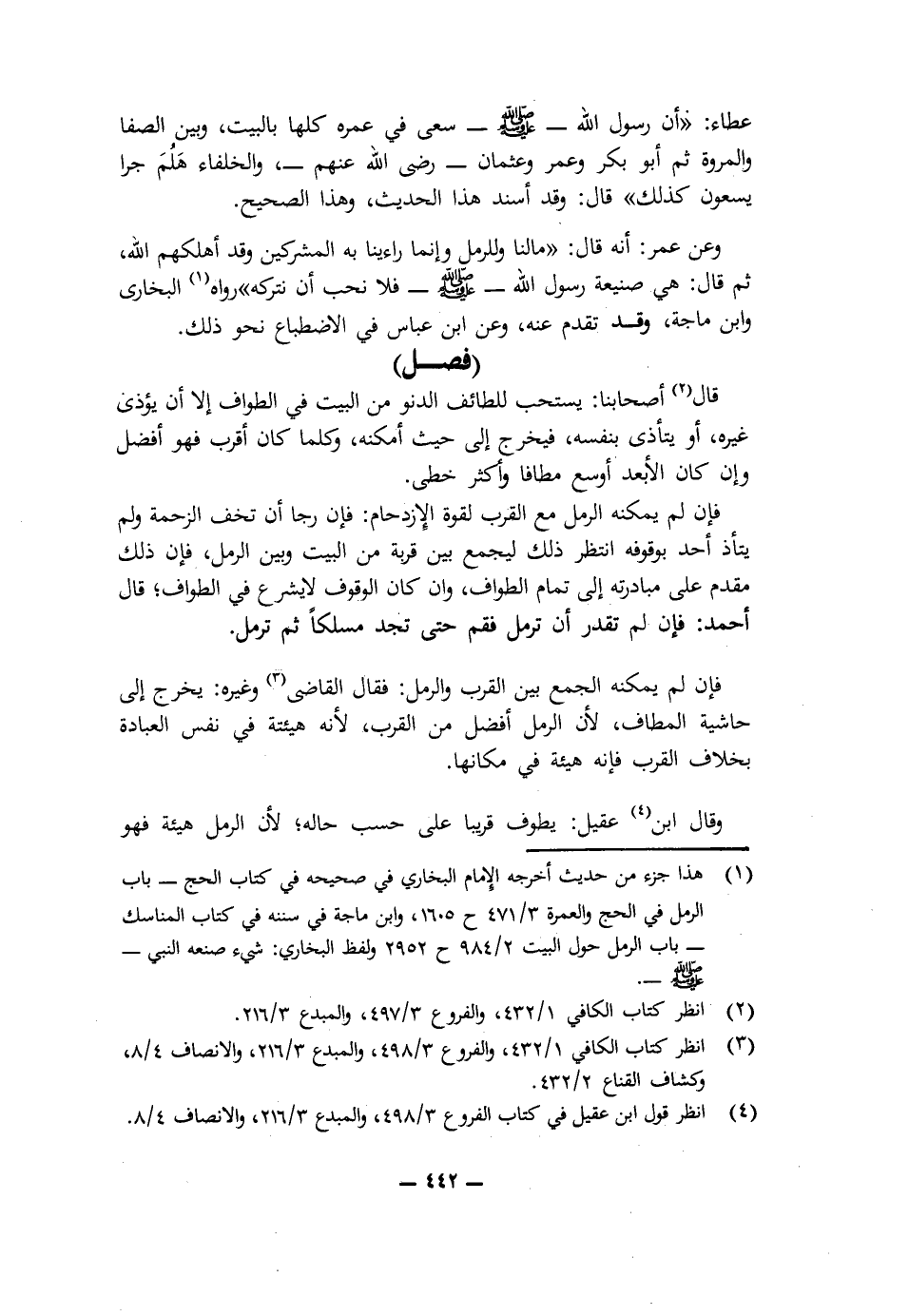 «وَعَنْ عُمَرَ: أَنَّهُ قَالَ: (مَا لَنَا وَلِلرَّمَلِ وَإِنَّمَا رَاءَيْنَا بِهِ الْمُشْرِكِينَ وَقَدْ أَهْلَكَهُمُ اللَّهُ، ثُمَّ قَالَ: هِيَ صَنِيعَةُ رَسُولِ اللَّهِ - صَلَّى اللَّهُ عَلَيْهِ وَسَلَّمَ - فَلَا نُحِبُّ أَنْ نَتْرُكَهُ)». رَوَاهُ الْبُخَارِيُّ، وَابْنُ مَاجَهْ، وَقَدْ تَقَدَّمَ عَنْهُ، وَعَنِ ابْنِ عَبَّاسٍ فِي الِاضْطِبَاعِ نَحْوَ ذَلِكَ.