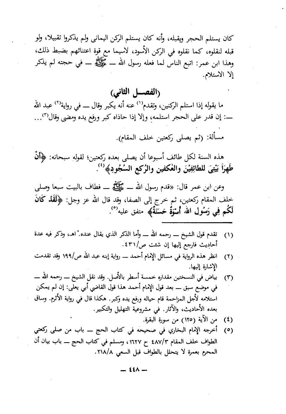 وَعَنِ ابْنِ عُمَرَ قَالَ: «(قَدِمَ رَسُولُ اللَّهِ - صَلَّى اللَّهُ عَلَيْهِ وَسَلَّمَ - فَطَافَ بِالْبَيْتِ سَبْعًا وَصَلَّى خَلْفَ الْمَقَامِ رَكْعَتَيْنِ، ثُمَّ خَرَجَ إِلَى الصَّفَا، وَقَدْ قَالَ اللَّهُ عَزَّ وَجَلَّ: {لَقَدْ كَانَ لَكُمْ فِي رَسُولِ اللَّهِ أُسْوَةٌ حَسَنَةٌ} [الأحزاب: 21].» مُتَّفَقٌ عَلَيْهِ.