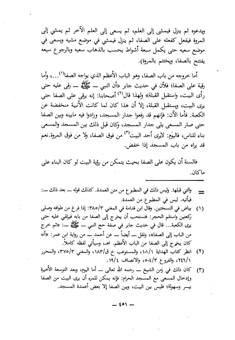 أَمَّا خُرُوجُهُ مِنْ بَابِ الصَّفَا وَهُوَ الْبَابُ الْأَعْظَمُ الَّذِي يُوَاجِهُ الصَّفَا ... ، وَأَمَّا رُقِيُّهُ عَلَى الصَّفَا ; فَلِأَنَّ فِي حَدِيثِ جَابِرٍ: " «أَنَّ النَّبِيَّ - صَلَّى اللَّهُ عَلَيْهِ وَسَلَّمَ - رَقَى عَلَيْهِ حَتَّى رَأَى الْبَيْتَ، وَاسْتَقْبَلَ الْقِبْلَةَ» " وَلِهَذَا قَالَ أَصْحَابُنَا: إِنَّهُ يَرْقَى عَلَى الصَّفَا حَتَّى يَرَى الْبَيْتَ وَيَسْتَقْبِلَ الْقِبْلَةَ، إِلَّا أَنَّ هَذَا كَانَ لَمَّا كَانَتِ الْأَبْنِيَةُ مُنْخَفِضَةً عَنِ الْكَعْبَةِ. فَأَمَّا الْآنَ فَإِنَّهُمْ قَدْ رَفَعُوا جِدَارَ الْمَسْجِدِ وَزَادُوا فِيهِ مَا بَيْنَهُ وَبَيْنَ الصَّفَا حَتَّى صَارَ الْمَسْعَى يَلِي جِدَارَ الْمَسْجِدِ، وَكَانَ قَبْلَ ذَلِكَ بَيْنَ الْمَسْجِدِ وَالْمَسْعَى بِنَاءٌ لِلنَّاسِ، فَالْيَوْمَ: لَا يَرَى أَحَدٌ الْبَيْتَ مِنْ فَوْقِ الصَّفَا، وَلَا مِنْ فَوْقِ الْمَرْوَةِ، نَعَمْ قَدْ يَرَاهُ مِنْ بَابِ الْمَسْجِدِ إِذَا خَفَضَ.