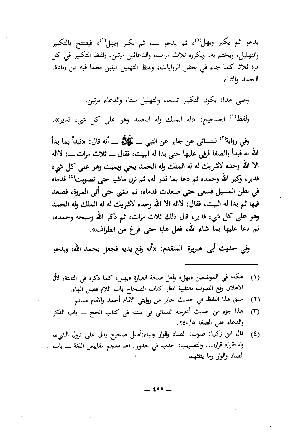 وَفِي رِوَايَةٍ لِلنَّسَائِيِّ عَنْ جَابِرٍ عَنِ النَّبِيِّ - صَلَّى اللَّهُ عَلَيْهِ وَسَلَّمَ - أَنَّهُ قَالَ: " «نَبْدَأُ بِمَا بَدَأَ اللَّهُ بِهِ فَبَدَأَ بِالصَّفَا، فَرَقَى عَلَيْهَا حَتَّى بَدَا لَهُ الْبَيْتُ، فَقَالَ ثَلَاثَ مَرَّاتٍ: لَا إِلَهَ إِلَّا اللَّهُ وَحْدَهُ لَا شَرِيكَ لَهُ، لَهُ الْمُلْكُ وَلَهُ الْحَمْدُ يُحْيِي وَيُمِيتُ وَهُوَ عَلَى كُلِّ شَيْءٍ قَدِيرٌ، وَكَبَّرَ اللَّهَ وَحَمِدَهُ ثُمَّ دَعَا بِمَا قُدِّرَ لَهُ، ثُمَّ نَزَلَ مَاشِيًا حَتَّى تَصَوَّبَتْ قَدَمَاهُ فِي بَطْنِ الْمَسِيلِ فَسَعَى حَتَّى صَعِدَتْ قَدَمَاهُ، ثُمَّ مَشَى حَتَّى أَتَى الْمَرْوَةَ فَصَعِدَ فِيهَا ثُمَّ بَدَا لَهُ الْبَيْتُ، فَقَالَ: لَا إِلَهَ إِلَّا اللَّهُ وَحْدَهُ لَا شَرِيكَ لَهُ، لَهُ الْمُلْكُ وَلَهُ الْحَمْدُ يُحْيِي وَيُمِيتُ وَهُوَ عَلَى كُلِّ شَيْءٍ قَدِيرٌ، قَالَ ذَلِكَ ثَلَاثَ مَرَّاتٍ، ثُمَّ ذَكَرَ اللَّهَ وَسَبَّحَهُ وَحَمِدَهُ، ثُمَّ دَعَا عَلَيْهَا بِمَا شَاءَ اللَّهُ، فَعَلَ هَذَا حَتَّى فَرَغَ مِنَ الطَّوَافِ» ".