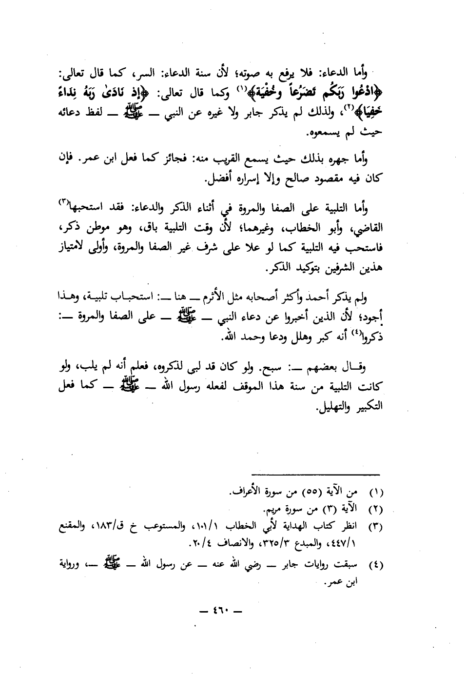 وَأَمَّا الدُّعَاءُ فَلَا يَرْفَعُ بِهِ صَوْتَهُ ; لِأَنَّ سُنَّةَ الدُّعَاءِ: السِّرُّ، كَمَا قَالَ تَعَالَى: {ادْعُوا رَبَّكُمْ تَضَرُّعًا وَخُفْيَةً} [الأعراف: 55]، وَكَمَا قَالَ تَعَالَى: {إِذْ نَادَى رَبَّهُ نِدَاءً خَفِيًّا} [مريم: 3]، وَلِذَلِكَ لَمْ يَذْكُرْ جَابِرٌ وَلَا غَيْرُهُ عَنِ النَّبِيِّ - صَلَّى اللَّهُ عَلَيْهِ وَسَلَّمَ - لَفْظَ دُعَائِهِ، حَيْثُ لَمْ يَسْمَعُوهُ.