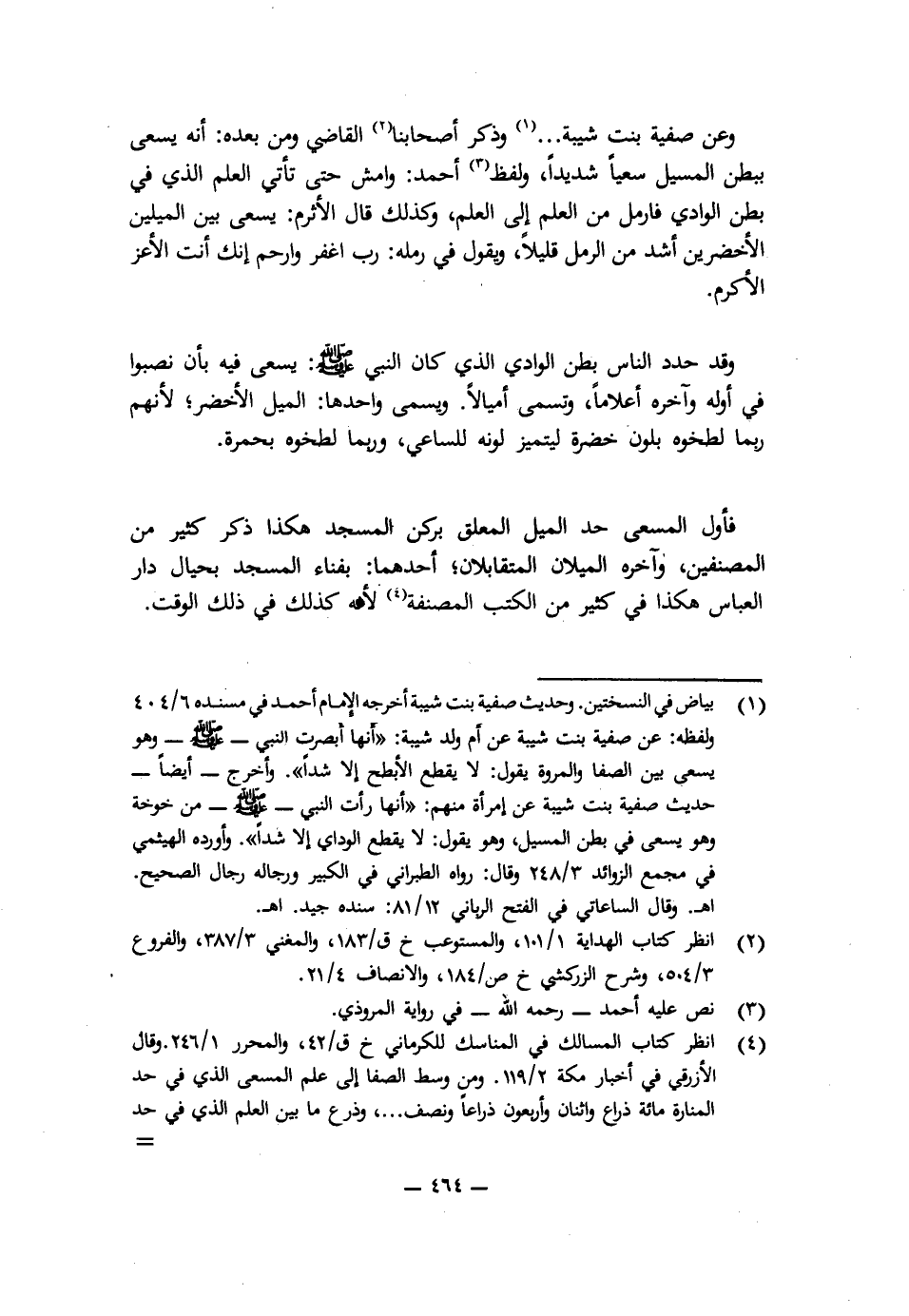 وَعَنْ صَفِيَّةَ بِنْتِ شَيْبَةَ ... وَذَكَرَ أَصْحَابُنَا الْقَاضِي وَمَنْ بَعْدَهُ: أَنَّهُ يَسْعَى بِبَطْنِ الْمَسِيلِ سَعْيًا شَدِيدًا، وَلَفْظُ أَحْمَدَ: وَامْشِ حَتَّى تَأْتِيَ الْعَلَمَ الَّذِي فِي بَطْنِ الْوَادِي فَارْمُلْ مِنَ الْعَلَمِ إِلَى الْعَلَمِ، وَكَذَلِكَ قَالَ الْأَثْرَمُ: يَسْعَى بَيْنَ الْمِيلَيْنِ الْأَخْضَرَيْنِ أَشَدَّ مِنَ الرَّمَلِ قَلِيلًا، وَيَقُولُ فِي رَمَلِهِ: رَبِّ اغْفِرْ وَارْحَمْ إِنَّكَ أَنْتَ الْأَعَزُّ الْأَكْرَمُ.