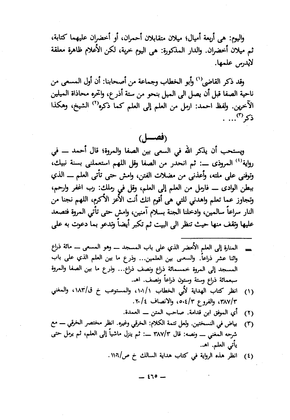وَقَدْ ذَكَرَ الْقَاضِي وَأَبُو الْخَطَّابِ وَجَمَاعَةٌ مِنْ أَصْحَابِنَا: أَنَّ أَوَّلَ الْمَسْعَى مِنْ نَاحِيَةِ الصَّفَا قَبْلَ أَنْ يَصِلَ إِلَى الْمِيلِ بِنَحْوٍ مِنْ سِتَّةِ أَذْرُعٍ، وَآخِرُهُ مُحَاذَاةُ الْمِيلَيْنِ الْآخَرَيْنِ، وَلَفْظُ أَحْمَدَ: ارْمُلْ مِنَ الْعَلَمِ إِلَى الْعَلَمِ كَمَا ذَكَرَهُ الشَّيْخُ، وَهَكَذَا ذَكَرَ ... .