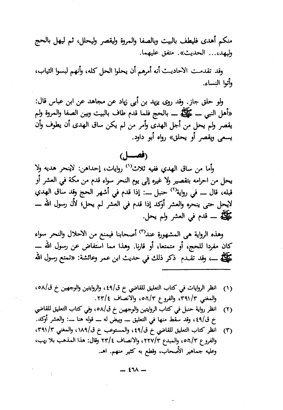 وَأَمَّا مَنْ سَاقَ الْهَدْيَ فَفِيهِ ثَلَاثُ رِوَايَاتٍ ; إِحْدَاهُنَّ: لَا يَنْحَرُ هَدْيَهُ، وَلَا يَحِلُّ مِنْ إِحْرَامِهِ بِتَقْصِيرٍ وَلَا غَيْرِهِ إِلَى يَوْمِ النَّحْرِ سَوَاءٌ قَدِمَ مِنْ مَكَّةَ فِي الْعَشْرِ أَوْ قَبْلَهُ، قَالَ - فِي رِوَايَةِ - حَنْبَلٍ: إِذَا قَدِمَ فِي أَشْهُرِ الْحَجِّ وَقَدْ سَاقَ الْهَدْيَ لَا يَحِلُّ حَتَّى يَنْحَرَهُ، وَالْعَشْرُ أَوْكَدُ إِذَا قَدِمَ فِي الْعَشْرِ لَمْ يَحِلَّ ; لِأَنَّ رَسُولَ اللَّهِ - صَلَّى اللَّهُ عَلَيْهِ وَسَلَّمَ - قَدِمَ فِي الْعَشْرِ وَلَمْ يَحِلَّ.