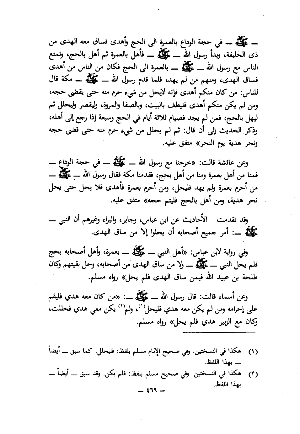 وَفِي رِوَايَةٍ لِابْنِ عَبَّاسٍ: " «أَهَلَّ النَّبِيُّ - صَلَّى اللَّهُ عَلَيْهِ وَسَلَّمَ - بِعُمْرَةٍ، وَأَهَلَّ أَصْحَابُهُ بِحَجٍّ فَلَمْ يَحِلَّ النَّبِيُّ - صَلَّى اللَّهُ عَلَيْهِ وَسَلَّمَ - وَلَا مَنْ سَاقَ الْهَدْيَ مِنْ أَصْحَابِهِ، وَحَلَّ بَقِيَّتُهُمْ، وَكَانَ طَلْحَةُ بْنُ عُبَيْدِ اللَّهِ فِيمَنْ سَاقَ الْهَدْيَ فَلَمْ يَحِلَّ» " رَوَاهُ مُسْلِمٌ.