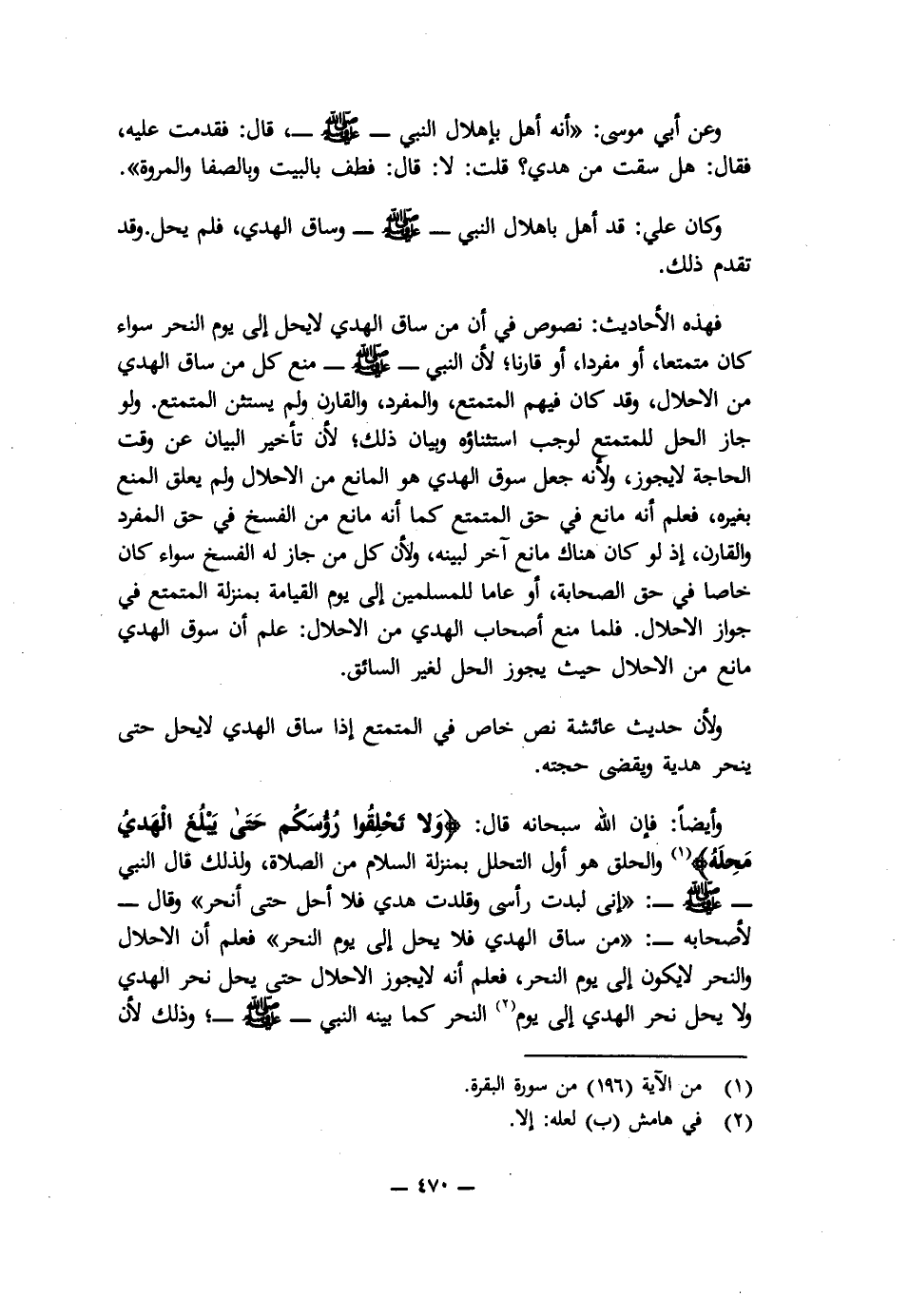 فَهَذِهِ الْأَحَادِيثُ: نُصُوصٌ فِي أَنَّ مَنْ سَاقَ الْهَدْيَ لَا يَحِلُّ إِلَى يَوْمِ النَّحْرِ سَوَاءٌ كَانَ مُتَمَتِّعًا، أَوْ مُفْرِدًا أَوْ قَارِنًا ; لِأَنَّ النَّبِيَّ - صَلَّى اللَّهُ عَلَيْهِ وَسَلَّمَ - مَنَعَ كُلَّ مَنْ سَاقَ الْهَدْيَ مِنَ الْإِحْلَالِ، وَقَدْ كَانَ فِيهِمُ الْمُتَمَتِّعُ وَالْمُفْرِدُ وَالْقَارِنُ وَلَمْ يَسْتَثْنِ الْمُتَمَتِّعَ، وَلَوْ جَازَ الْحِلُّ لِلْمُتَمَتِّعِ لَوَجَبَ اسْتِثْنَاؤُهُ وَبَيَانُ ذَلِكَ ; لِأَنَّ تَأْخِيرَ الْبَيَانِ عَنْ وَقْتِ الْحَاجَةِ لَا يَجُوزُ ; وَلِأَنَّهُ جَعَلَ سَوْقَ الْهَدْيِ هُوَ الْمَانِعَ مِنَ الْإِحْلَالِ وَلَمْ يُعَلِّقِ الْمَنْعَ بِغَيْرِهِ، فَعُلِمَ أَنَّهُ مَانِعٌ فِي حَقِّ الْمُتَمَتِّعِ كَمَا أَنَّهُ مَانِعٌ مِنَ الْفَسْخِ فِي حَقِّ الْمُفْرِدِ وَالْقَارِنِ، إِذْ لَوْ كَانَ هُنَاكَ مَانِعٌ آخَرُ لَبَيَّنَهُ، وَلِأَنَّ كُلَّ مَنْ جَازَ لَهُ الْفَسْخُ سَوَاءٌ كَانَ خَاصًّا فِي حَقِّ الصَّحَابَةِ أَوْ عَامًّا لِلْمُسْلِمِينَ إِلَى يَوْمِ الْقِيَامَةِ بِمَنْزِلَةِ الْمُتَمَتِّعِ فِي جَوَازِ الْإِحْلَالِ، فَلَمَّا مُنِعَ أَصْحَابُ الْهَدْيِ مِنَ الْإِحْلَالِ عُلِمَ أَنَّ سَوْقَ الْهَدْيِ مَانِعٌ مِنَ الْإِحْلَالِ حَيْثُ يَجُوزُ الْحِلُّ لِغَيْرِ السَّائِقِ.