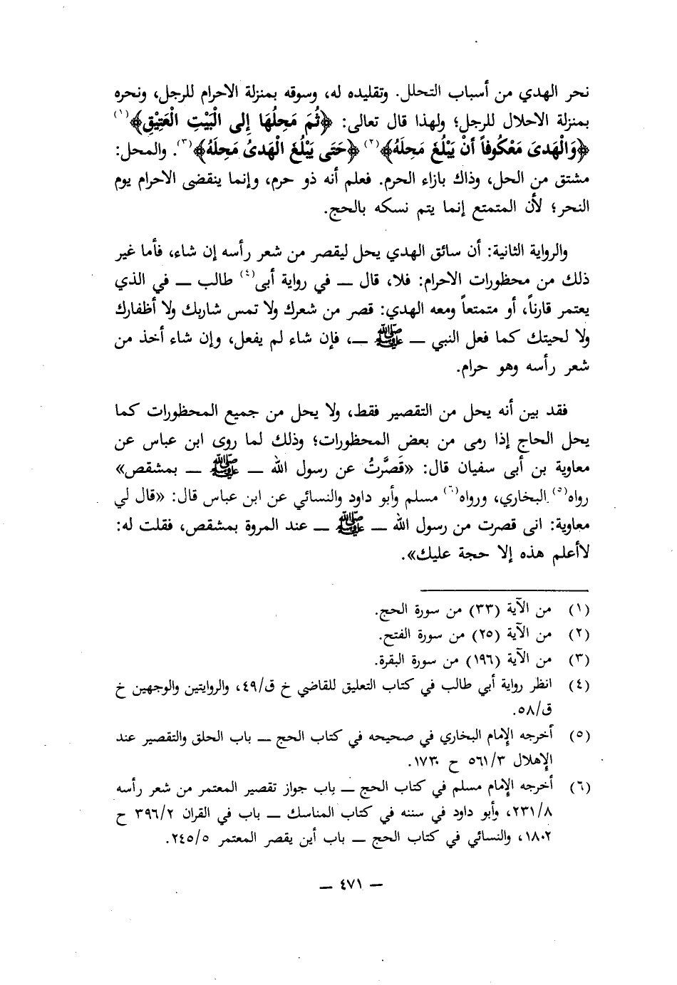 فَقَدْ بَيَّنَ أَنَّهُ يَحِلُّ مِنَ التَّقْصِيرِ فَقَطْ، وَلَا يَحِلُّ مِنْ جَمِيعِ الْمَحْظُورَاتِ كَمَا يَحِلُّ الْحَاجُّ إِذَا رَمَى مِنْ بَعْضِ الْمَحْظُورَاتِ ; وَذَلِكَ لِمَا رَوَى ابْنُ عَبَّاسٍ «عَنْ مُعَاوِيَةَ بْنِ أَبِي سُفْيَانَ قَالَ: " قَصَّرْتُ عَنْ رَسُولِ اللَّهِ - صَلَّى اللَّهُ عَلَيْهِ وَسَلَّمَ - بِمِشْقَصٍ» رَوَاهُ الْبُخَارِيُّ، وَرَوَاهُ مُسْلِمٌ وَأَبُو دَاوُدَ وَالنَّسَائِيُّ عَنِ ابْنِ عَبَّاسٍ قَالَ: " «قَالَ لِي مُعَاوِيَةُ: إِنِّي قَصَّرْتُ مِنْ رَسُولِ اللَّهِ - صَلَّى اللَّهُ عَلَيْهِ وَسَلَّمَ - عِنْدَ الْمَرْوَةِ بِمِشْقَصٍ، فَقُلْتُ لَهُ: لَا أَعْلَمُ هَذِهِ إِلَّا حُجَّةً عَلَيْكَ» ".