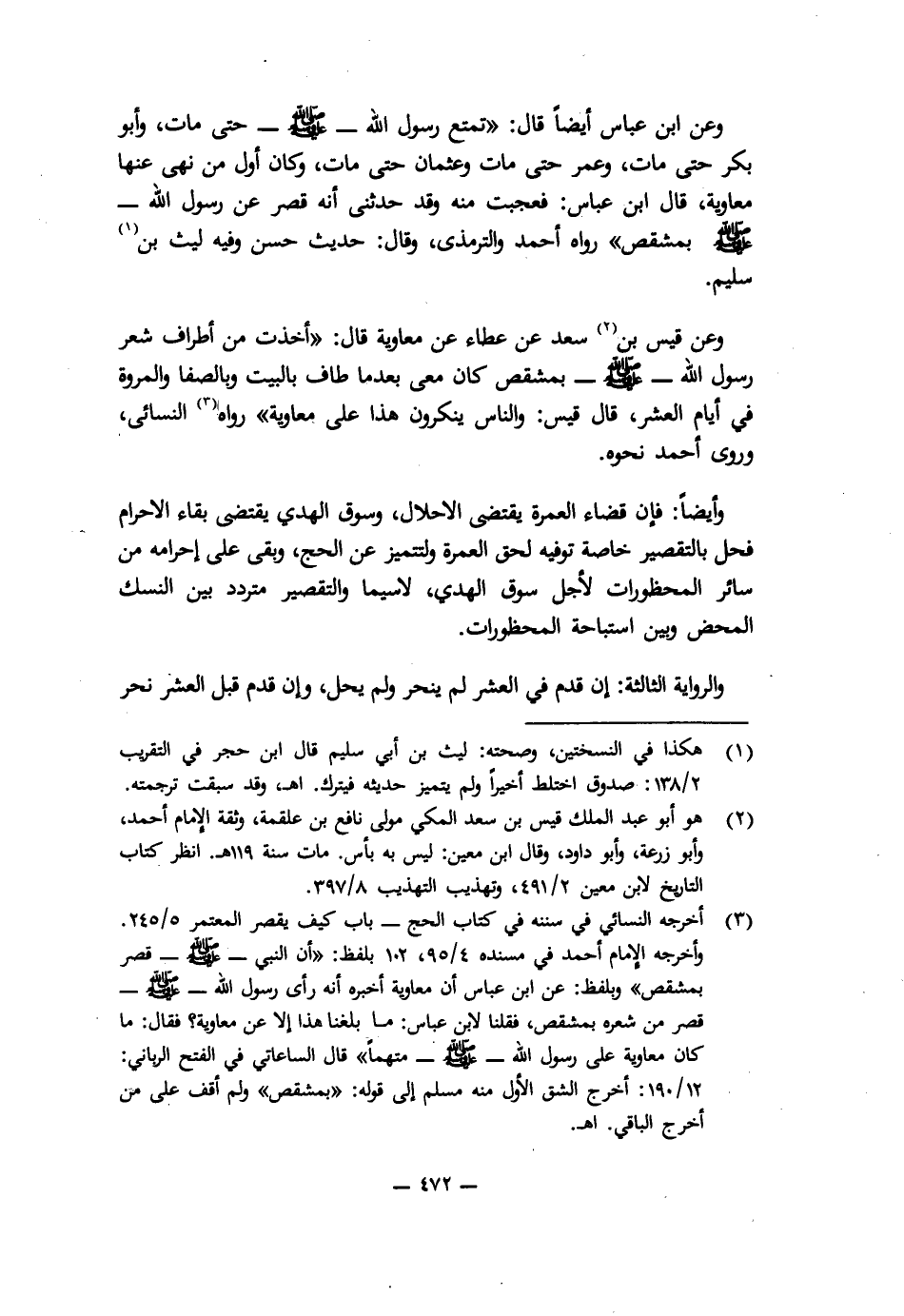 وَعَنِ ابْنِ عَبَّاسٍ أَيْضًا قَالَ: " «تَمَتَّعَ رَسُولُ اللَّهِ - صَلَّى اللَّهُ عَلَيْهِ وَسَلَّمَ - حَتَّى مَاتَ، وَأَبُو بَكْرٍ حَتَّى مَاتَ، وَعُمَرُ حَتَّى مَاتَ، وَعُثْمَانُ حَتَّى مَاتَ، وَكَانَ أَوَّلَ مَنْ نَهَى عَنْهَا مُعَاوِيَةُ، قَالَ ابْنُ عَبَّاسٍ: فَعَجِبْتُ مِنْهُ، وَقَدْ حَدَّثَنِي أَنَّهُ قَصَّرَ عَنْ رَسُولِ اللَّهِ - صَلَّى اللَّهُ عَلَيْهِ وَسَلَّمَ - بِمِشْقَصٍ» " رَوَاهُ أَحْمَدُ وَالتِّرْمِذِيُّ، وَقَالَ: حَدِيثٌ حَسَنٌ وَفِيهِ لَيْثُ بْنُ سُلَيْمٍ.
