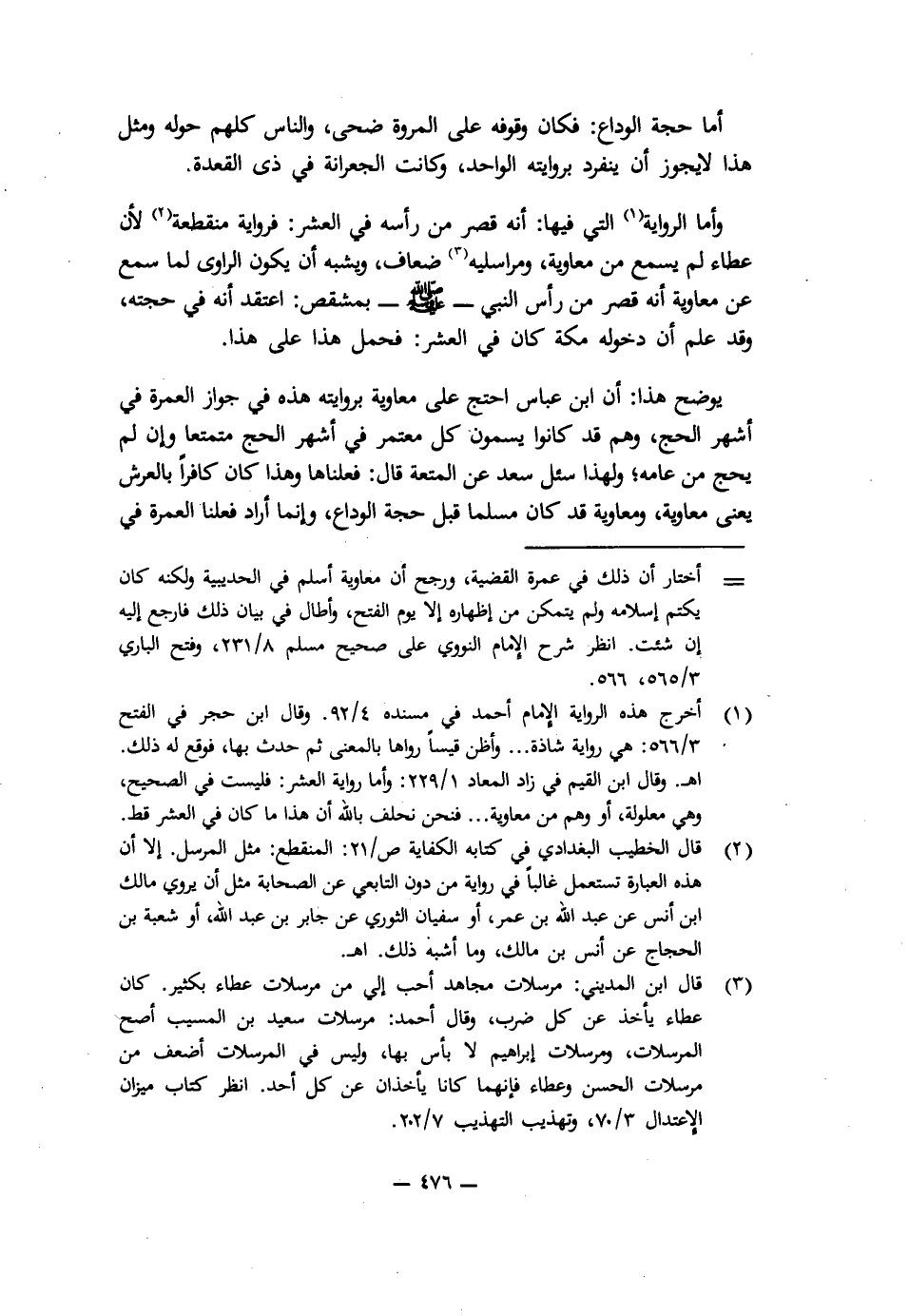 يُوَضِّحُ هَذَا أَنَّ ابْنَ عَبَّاسٍ احْتَجَّ عَلَى مُعَاوِيَةَ بِرِوَايَتِهِ هَذِهِ فِي جَوَازِ الْعُمْرَةِ فِي أَشْهُرِ الْحَجِّ، وَهُمْ قَدْ كَانُوا يُسَمُّونَ كُلَّ مُعْتَمِرٍ فِي أَشْهُرِ الْحَجِّ مُتَمَتِّعًا، وَإِنْ لَمْ يَحُجَّ مِنْ عَامِهِ، وَلِهَذَا سُئِلَ سَعْدٌ عَنِ الْمُتْعَةِ قَالَ: فَعَلْنَاهَا وَهَذَا كَانَ كَافِرًا بِالْعَرْشِ - يَعْنِي مُعَاوِيَةَ -، وَمُعَاوِيَةُ قَدْ كَانَ مُسْلِمًا قَبْلَ حَجَّةِ الْوَدَاعِ، وَإِنَّمَا أَرَادَ فَعَلْنَا الْعُمْرَةَ فِي