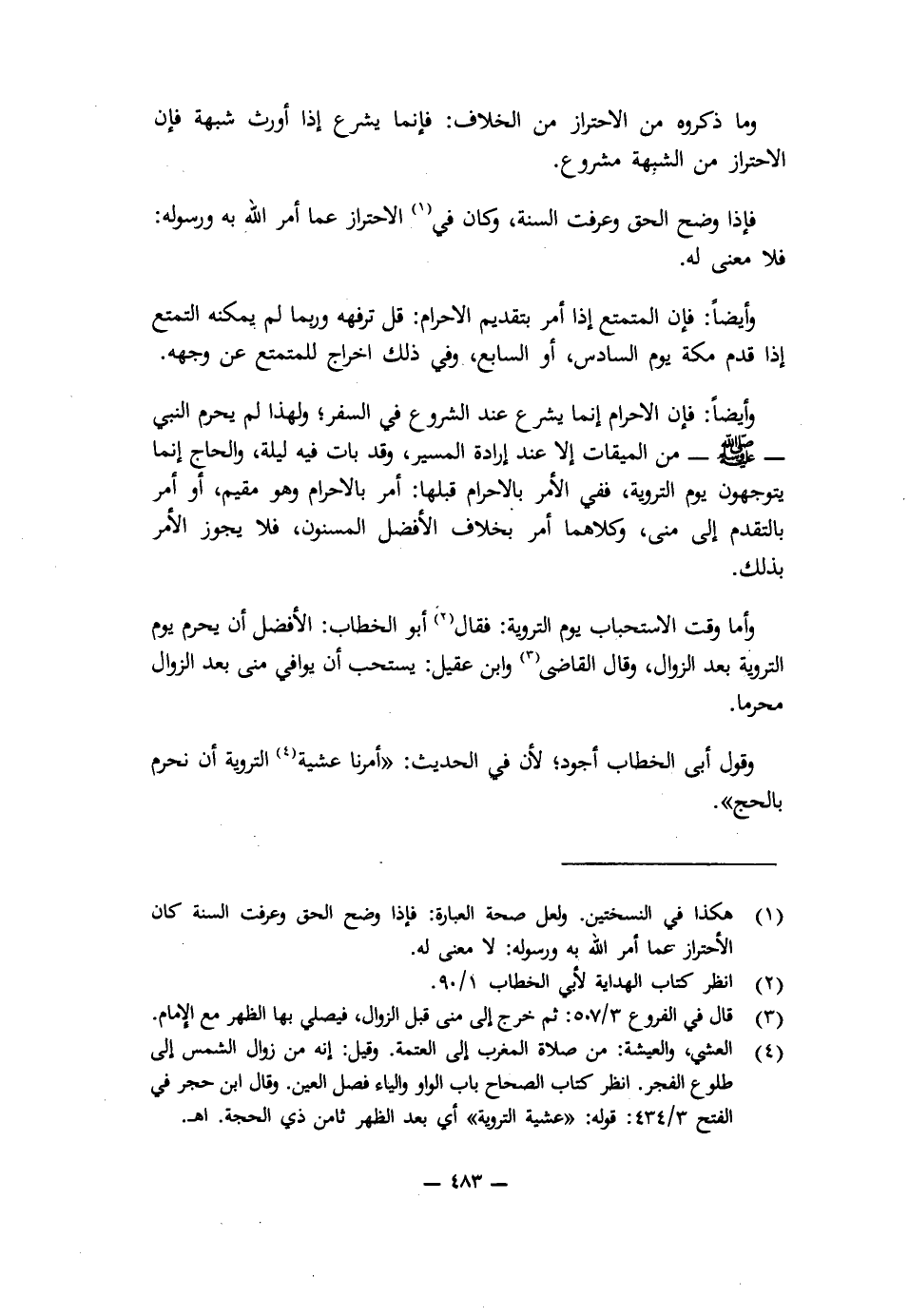 وَأَمَّا وَقْتُ الِاسْتِحْبَابِ يَوْمَ التَّرْوِيَةِ، فَقَالَ أَبُو الْخَطَّابِ: الْأَفْضَلُ أَنْ يُحْرِمَ يَوْمَ التَّرْوِيَةِ بَعْدَ الزَّوَالِ، وَقَالَ الْقَاضِي وَابْنُ عَقِيلٍ: يُسْتَحَبُّ أَنْ يُوَافِيَ مِنًى بَعْدَ الزَّوَالِ مُحْرِمًا.