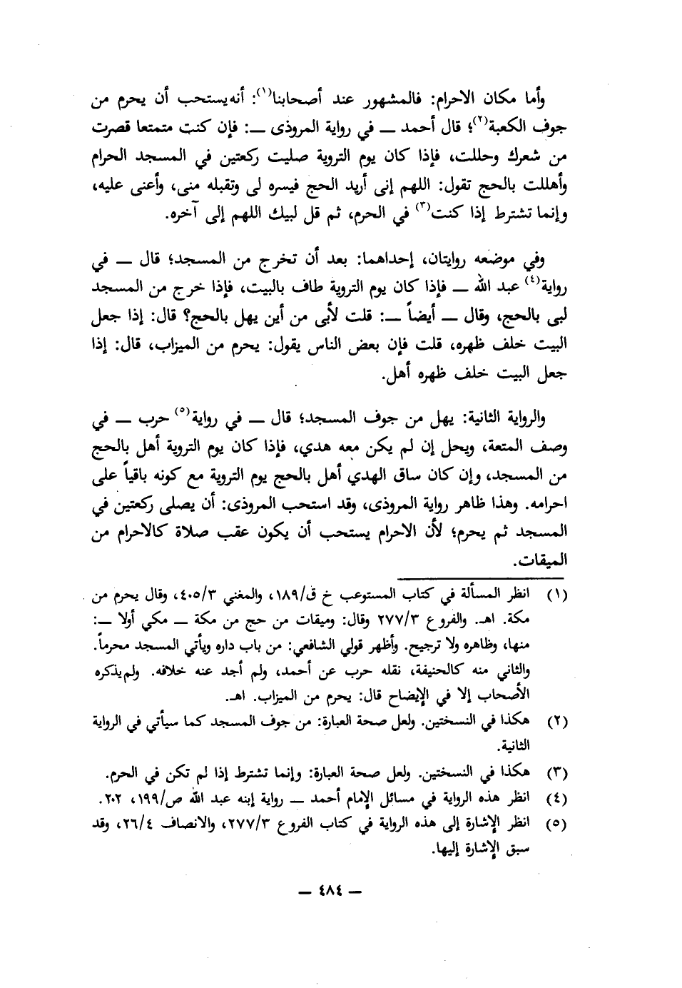 إِحْدَاهُمَا: بَعْدَ أَنْ تَخْرُجَ مِنَ الْمَسْجِدِ، قَالَ - فِي رِوَايَةِ عَبْدِ اللَّهِ -: فَإِذَا كَانَ يَوْمُ التَّرْوِيَةِ طَافَ بِالْبَيْتِ، فَإِذَا خَرَجَ مِنَ الْمَسْجِدِ لَبَّى بِالْحَجِّ، وَقَالَ - أَيْضًا -: قُلْتُ لِأَبِي: مِنْ أَيْنَ يُهِلُّ بِالْحَجِّ؟ قَالَ: إِذَا جَعَلَ الْبَيْتَ خَلْفَ ظَهْرِهِ، قُلْتُ: فَإِنَّ بَعْضَ النَّاسِ يَقُولُ: يُحْرِمُ مِنَ الْمِيزَابِ، قَالَ: إِذَا جَعَلَ الْبَيْتَ خَلْفَ ظَهْرِهِ أَهَلَّ.