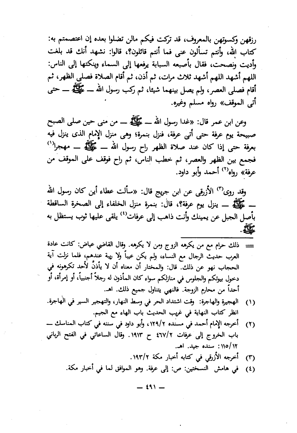 رِزْقُهُنَّ وَكِسْوَتُهُنَّ بِالْمَعْرُوفِ، قَدْ تَرَكْتُ فِيكُمْ مَا لَنْ تَضِلُّوا بَعْدَهُ إِنِ اعْتَصَمْتُمْ بِهِ: كِتَابَ اللَّهِ، وَأَنْتُمْ تَسْأَلُونَ عَنِّي فَمَا أَنْتُمْ قَائِلُونَ؟ قَالُوا: نَشْهَدُ أَنَّكَ قَدْ بَلَّغْتَ وَأَدَّيْتَ وَنَصَحْتَ، فَقَالَ بِأُصْبُعِهِ السَّبَّابَةِ يَرْفَعُهَا إِلَى السَّمَاءِ وَيَنْكُتُهَا إِلَى النَّاسِ: اللَّهُمَّ اشْهَدْ، اللَّهُمَّ اشْهَدْ ثَلَاثَ مَرَّاتٍ، ثُمَّ أَذَّنَ، ثُمَّ أَقَامَ الصَّلَاةَ فَصَلَّى الظُّهْرَ، ثُمَّ أَقَامَ فَصَلَّى الْعَصْرَ، وَلَمْ يُصَلِّ بَيْنَهُمَا شَيْئًا، ثُمَّ رَكِبَ رَسُولُ اللَّهِ - صَلَّى اللَّهُ عَلَيْهِ وَسَلَّمَ - حَتَّى أَتَى الْمَوْقِفَ» " رَوَاهُ مُسْلِمٌ وَغَيْرُهُ.