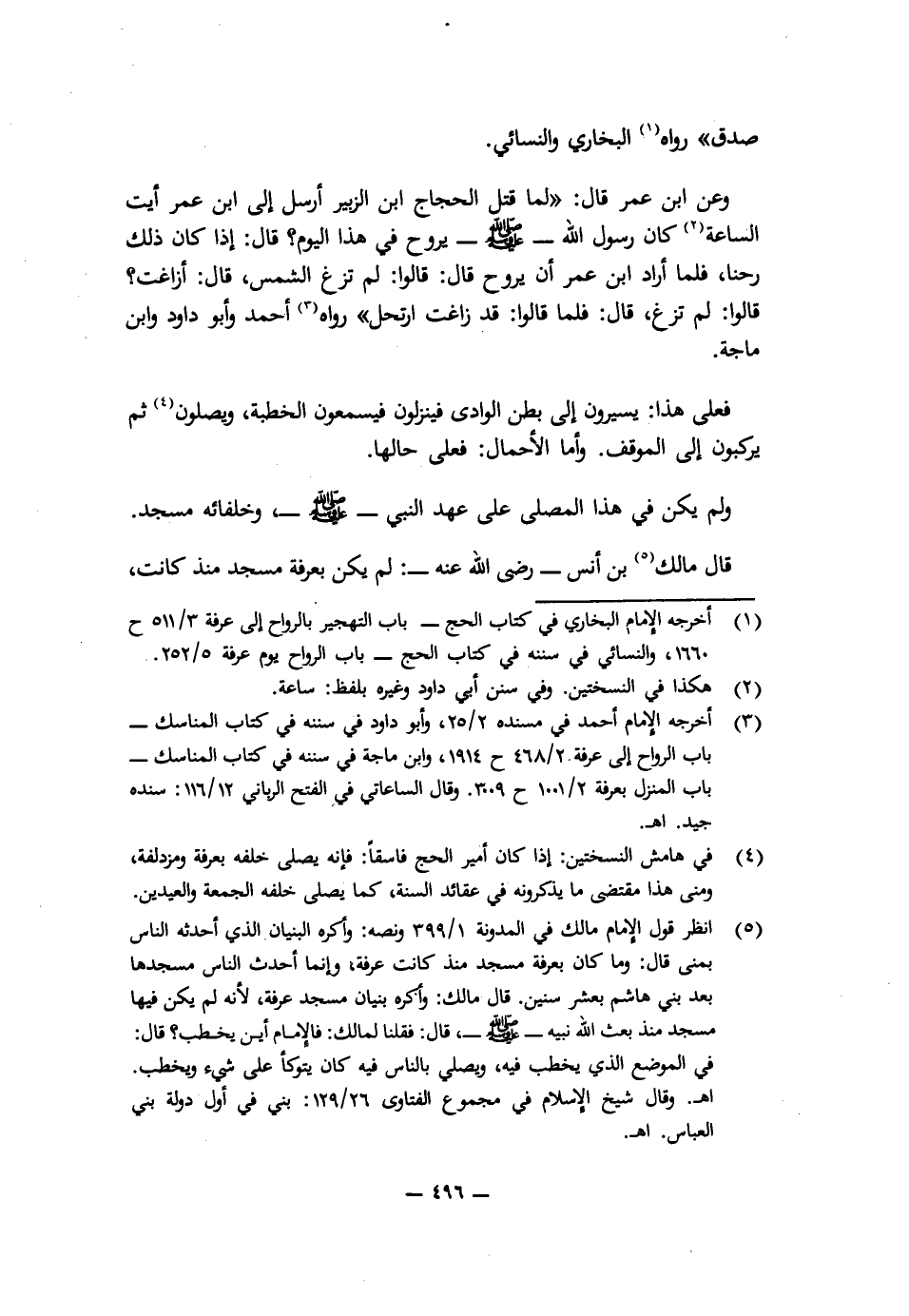 وَعَنِ ابْنِ عُمَرَ قَالَ: " لَمَّا قَتَلَ الْحَجَّاجُ ابْنَ الزُّبَيْرِ أَرْسَلَ إِلَى ابْنِ عُمَرَ أَيَّةُ سَاعَةٍ كَانَ رَسُولُ اللَّهِ - صَلَّى اللَّهُ عَلَيْهِ وَسَلَّمَ - يَرُوحُ فِي هَذَا الْيَوْمِ؟ قَالَ: إِذَا كَانَ ذَلِكَ رُحْنَا، فَلَمَّا أَرَادَ ابْنُ عُمَرَ أَنْ يَرُوحَ قَالَ: قَالُوا: لَمْ تَزِغِ الشَّمْسُ، قَالَ: أَزَاغَتْ؟ قَالُوا: لَمْ تَزِغْ، قَالَ: فَلَمَّا قَالُوا: قَدْ زَاغَتِ ارْتَحَلَ ". رَوَاهُ أَحْمَدُ وَأَبُو دَاوُدَ وَابْنُ مَاجَهْ.