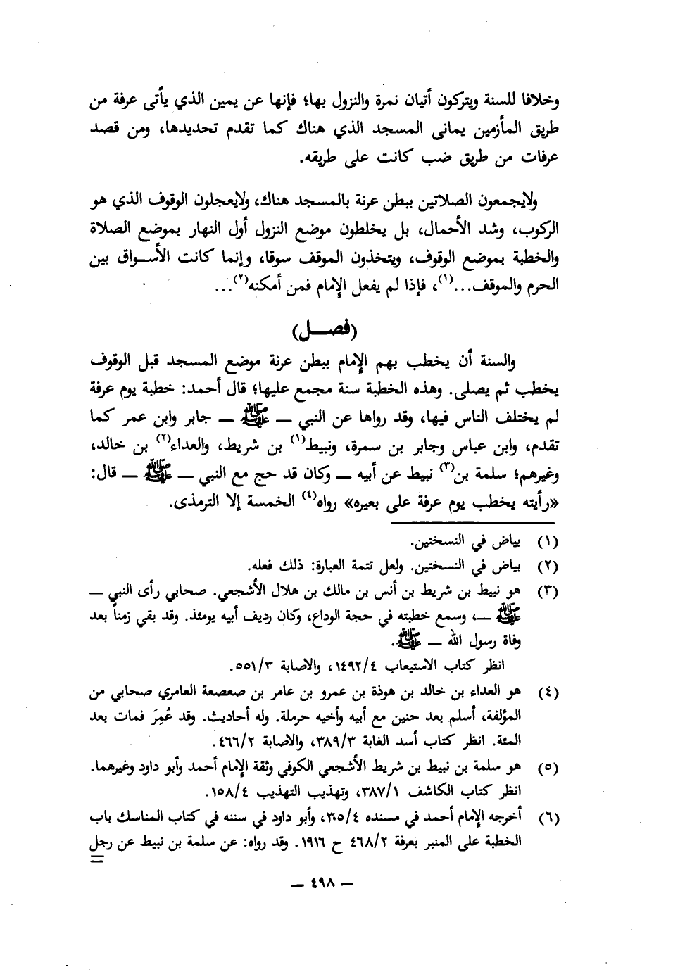 وَالسُّنَّةُ أَنْ يَخْطُبَ بِهِمُ الْإِمَامُ بِبَطْنِ عُرَنَةَ مَوْضِعَ الْمَسْجِدِ قَبْلَ الْوُقُوفِ يَخْطُبُ ثُمَّ يُصَلِّي، وَهَذِهِ الْخُطْبَةُ سُنَّةٌ مُجْمَعٌ عَلَيْهَا ; قَالَ أَحْمَدُ: خُطْبَةُ يَوْمِ عَرَفَةَ لَمْ يَخْتَلِفِ النَّاسُ فِيهَا، وَقَدْ رَوَاهَا عَنِ النَّبِيِّ - صَلَّى اللَّهُ عَلَيْهِ وَسَلَّمَ - جَابِرٌ وَابْنُ عُمَرَ كَمَا تَقَدَّمَ، وَابْنُ عَبَّاسٍ وَجَابِرُ بْنُ سَمُرَةَ، وَنُبَيْطُ بْنُ شَرِيطٍ، وَالْعَدَّاءُ بْنُ خَالِدٍ، وَغَيْرُهُمْ ; سَلَمَةُ بْنُ نُبَيْطٍ عَنْ أَبِيهِ - وَكَانَ قَدْ حَجَّ مَعَ النَّبِيِّ - صَلَّى اللَّهُ عَلَيْهِ وَسَلَّمَ - قَالَ: " «رَأَيْتُهُ يَخْطُبُ يَوْمَ عَرَفَةَ عَلَى بَعِيرِهِ» ". رَوَاهُ الْخَمْسَةُ إِلَّا التِّرْمِذِيَّ.