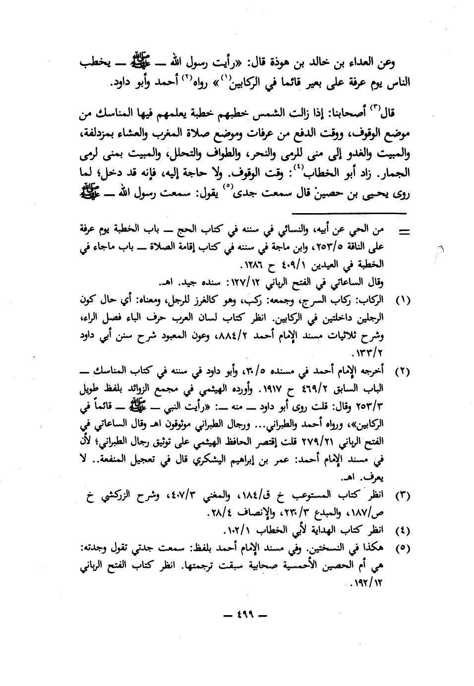 وَعَنِ الْعَدَّاءِ بْنِ خَالِدِ بْنِ هَوْذَةَ قَالَ: " «رَأَيْتُ رَسُولَ اللَّهِ - صَلَّى اللَّهُ عَلَيْهِ وَسَلَّمَ - يَخْطُبُ النَّاسَ يَوْمَ عَرَفَةَ عَلَى بَعِيرٍ قَائِمًا فِي الرِّكَابَيْنِ» ". رَوَاهُ أَحْمَدُ، وَأَبُو دَاوُدَ.