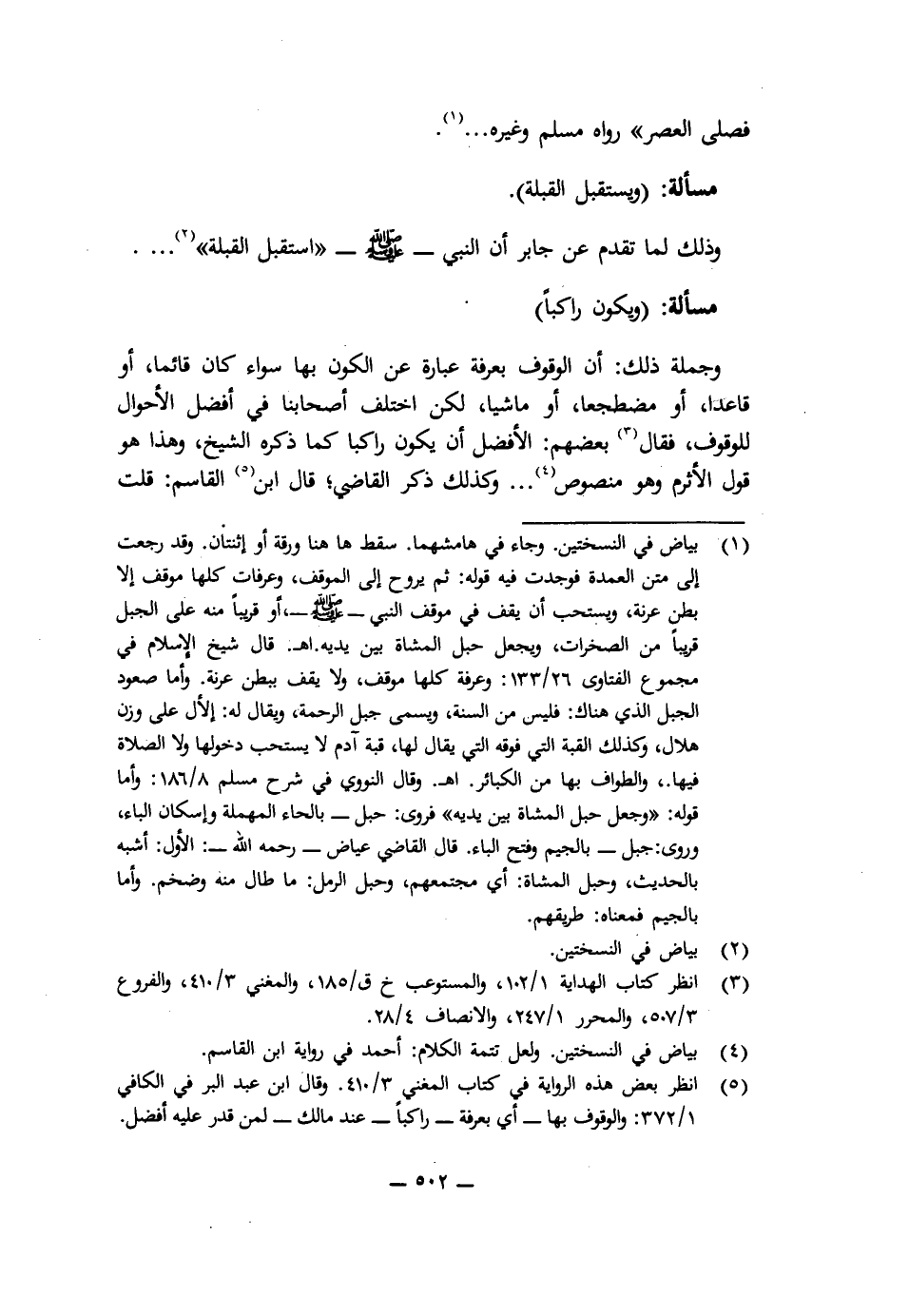 وَجُمْلَةُ ذَلِكَ: أَنَّ الْوُقُوفَ بِعَرَفَةَ عِبَارَةٌ عَنِ الْكَوْنِ بِهَا سَوَاءٌ كَانَ قَائِمًا، أَوْ قَاعِدًا، أَوْ مُضْطَجِعًا، أَوْ مَاشِيًا، لَكِنِ اخْتَلَفَ أَصْحَابُنَا فِي أَفْضَلِ الْأَحْوَالِ لِلْوُقُوفِ، فَقَالَ بَعْضُهُمْ: الْأَفْضَلُ أَنْ يَكُونَ رَاكِبًا كَمَا ذَكَرَهُ الشَّيْخُ، وَهَذَا هُوَ قَوْلُ الْأَثْرَمِ وَهُوَ مَنْصُوصٌ ... وَكَذَلِكَ ذَكَرَ الْقَاضِي ; قَالَ ابْنُ الْقَاسِمِ: قُلْتُ