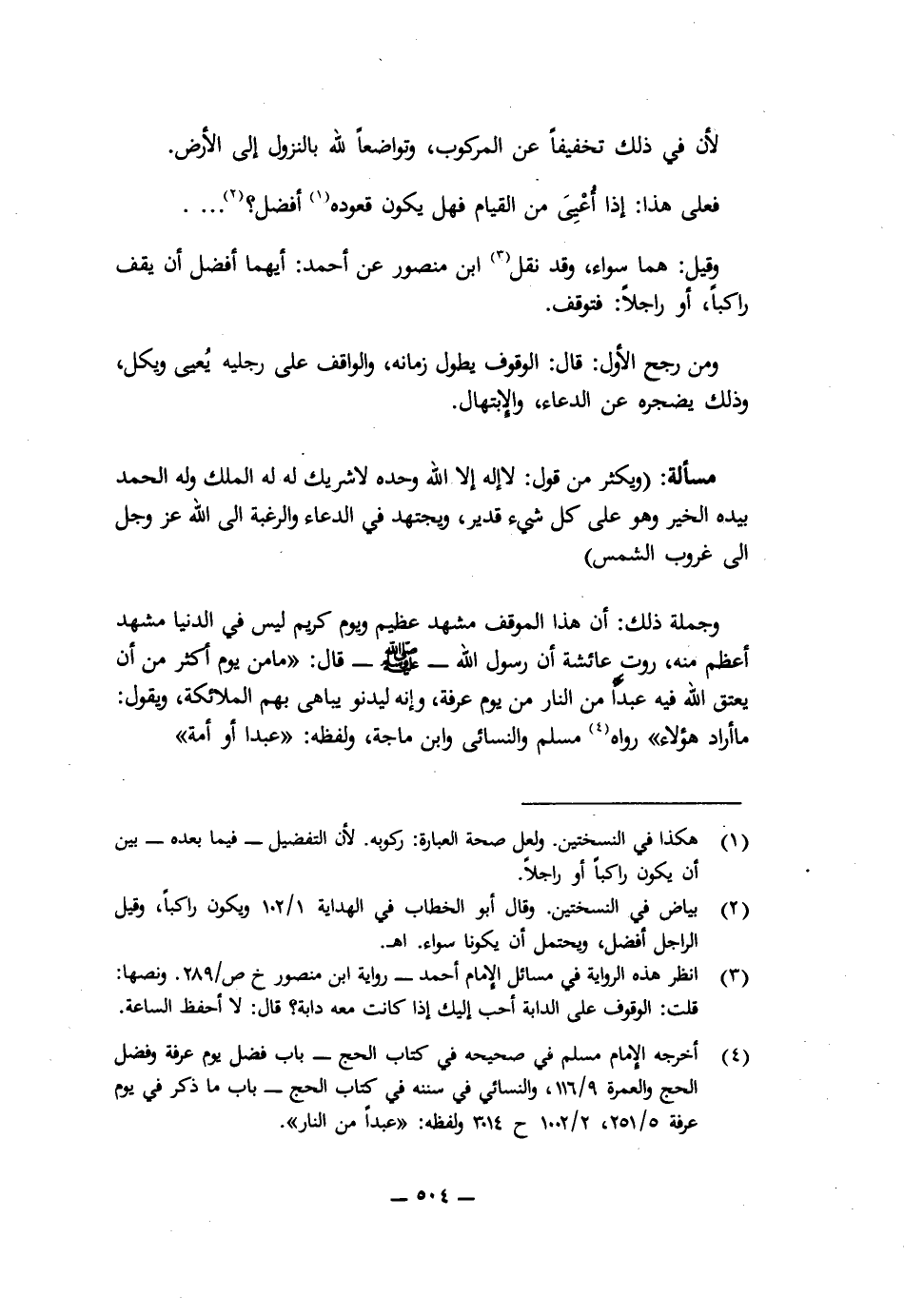وَجُمْلَةُ ذَلِكَ: أَنَّ هَذَا الْمَوْقِفَ مَشْهَدٌ عَظِيمٌ وَيَوْمٌ كَرِيمٌ لَيْسَ فِي الدُّنْيَا مَشْهَدٌ أَعْظَمَ مِنْهُ، رَوَتْ عَائِشَةُ أَنَّ رَسُولَ اللَّهِ - صَلَّى اللَّهُ عَلَيْهِ وَسَلَّمَ - قَالَ: " «مَا مِنْ يَوْمٍ أَكْثَرَ مِنْ أَنْ يُعْتِقَ اللَّهُ فِيهِ عَبْدًا مِنَ النَّارِ مِنْ يَوْمِ عَرَفَةَ، وَإِنَّهُ لَيَدْنُو يُبَاهِي بِهِمُ الْمَلَائِكَةَ، وَيَقُولُ: مَا أَرَادَ هَؤُلَاءِ» ". رَوَاهُ مُسْلِمٌ، وَالنَّسَائِيُّ، وَابْنُ مَاجَهْ. وَلَفْظُهُ " عَبْدًا أَوْ أَمَةً ".