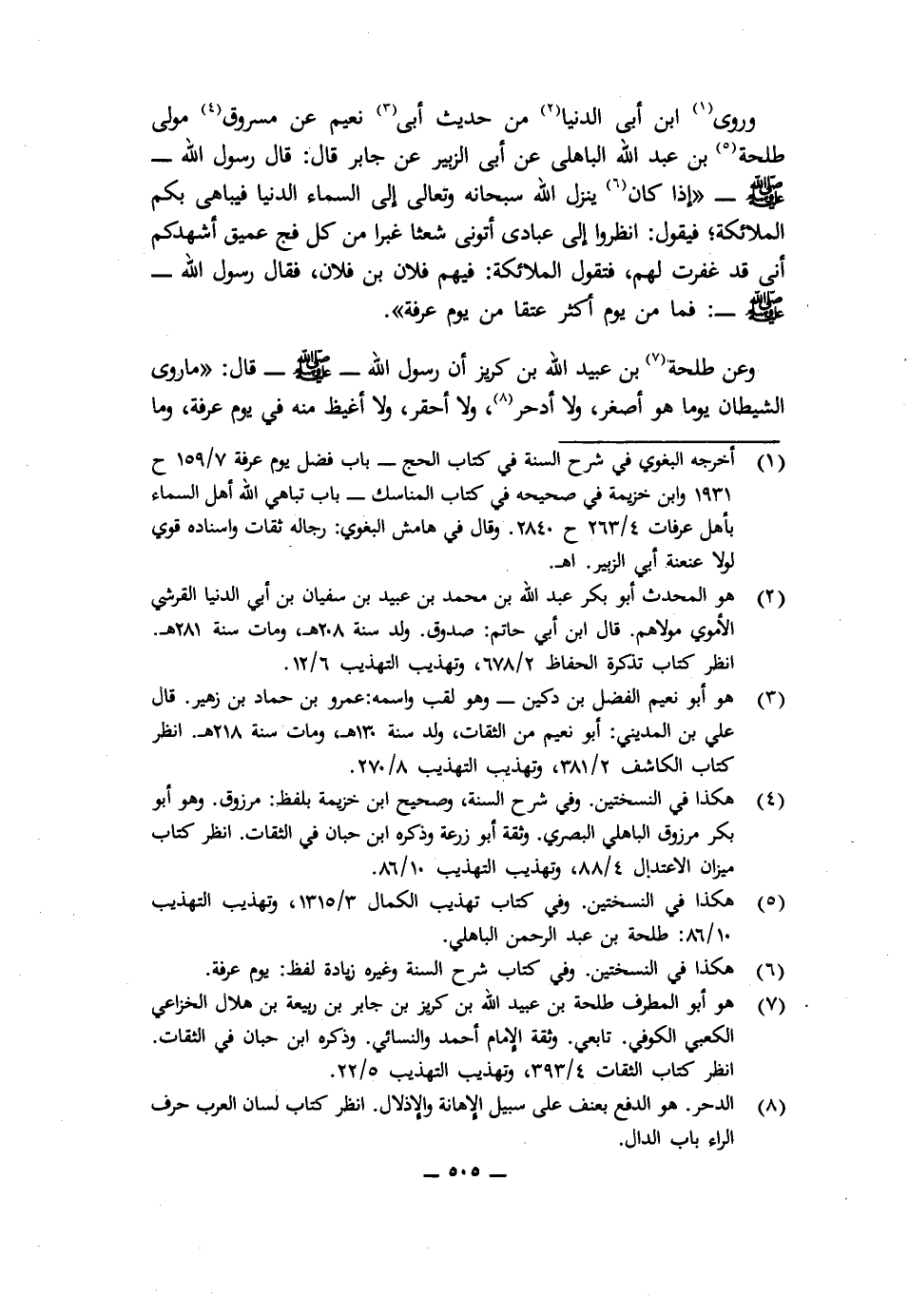 وَرَوَى ابْنُ أَبِي الدُّنْيَا مِنْ حَدِيثِ أَبِي نُعَيْمٍ، عَنْ مَسْرُوقٍ مَوْلَى طَلْحَةَ بْنِ عَبْدِ اللَّهِ الْبَاهِلِيِّ، عَنْ أَبِي الزُّبَيْرِ، عَنْ جَابِرٍ قَالَ: قَالَ رَسُولُ اللَّهِ - صَلَّى اللَّهُ عَلَيْهِ وَسَلَّمَ -: " «إِذَا كَانَ يَنْزِلُ اللَّهُ سُبْحَانَهُ وَتَعَالَى إِلَى السَّمَاءِ الدُّنْيَا فَيُبَاهِي بِكُمُ الْمَلَائِكَةَ ; فَيَقُولُ: انْظُرُوا إِلَى عِبَادِي أَتَوْنِي شُعْثًا غُبْرًا مِنْ كُلِّ فَجٍّ عَمِيقٍ، أُشْهِدُكُمْ أَنِّي قَدْ غَفَرْتُ لَهُمْ، فَتَقُولُ الْمَلَائِكَةُ: فِيهِمْ فُلَانُ بْنُ فُلَانٍ، فَقَالَ رَسُولُ اللَّهِ - صَلَّى اللَّهُ عَلَيْهِ وَسَلَّمَ -: فَمَا مِنْ يَوْمٍ أَكْثَرَ عِتْقًا مِنْ يَوْمِ عَرَفَةَ» ".