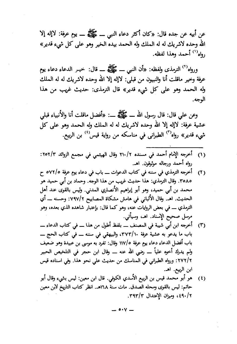 وَعَنْ عَلِيٍّ قَالَ: قَالَ رَسُولُ اللَّهِ - صَلَّى اللَّهُ عَلَيْهِ وَسَلَّمَ -: " «أَفْضَلُ مَا قُلْتُ أَنَا وَالْأَنْبِيَاءُ قَبْلِي عَشِيَّةَ عَرَفَةَ: لَا إِلَهَ إِلَّا اللَّهُ وَحْدَهُ لَا شَرِيكَ لَهُ، لَهُ الْمُلْكُ وَلَهُ الْحَمْدُ وَهُوَ عَلَى كُلِّ شَيْءٍ قَدِيرٌ» ". رَوَاهُ الطَّبَرَانِيُّ فِي مَنَاسِكِهِ مِنْ رِوَايَةِ قَيْسِ بْنِ الرَّبِيعِ.