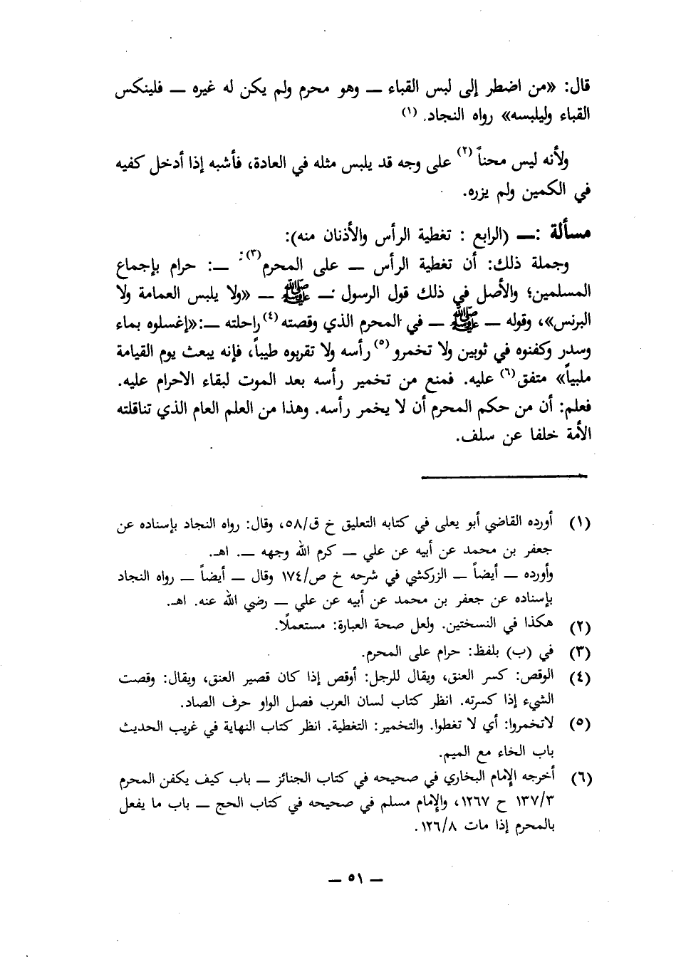 وَجُمْلَةُ ذَلِكَ: أَنَّ تَغْطِيَةَ الرَّأْسِ - عَلَى الْمُحْرِمِ - حَرَامٌ بِإِجْمَاعِ الْمُسْلِمِينَ؛ وَالْأَصْلُ فِي ذَلِكَ قَوْلُ الرَّسُولِ - صَلَّى اللَّهُ عَلَيْهِ وَسَلَّمَ - " «وَلَا يَلْبَسُ الْعِمَامَةَ وَلَا الْبُرْنُسَ» " وَقَوْلُهُ - صَلَّى اللَّهُ عَلَيْهِ وَسَلَّمَ - فِي الْمُحْرِمِ الَّذِي وَقَصَتْهُ رَاحِلَتُهُ -: " «اغْسِلُوهُ بِمَاءٍ وَسِدْرٍ وَكَفِّنُوهُ فِي ثَوْبَيْنِ وَلَا تُخَمِّرُوا رَأْسَهُ وَلَا تُقَرِّبُوهُ طِيبًا، فَإِنَّهُ يُبْعَثُ يَوْمَ الْقِيَامَةِ مُلَبِّيًا» " مُتَّفَقٌ عَلَيْهِ. فَمَنَعَ مِنْ تَخْمِيرِ رَأْسِهِ بَعْدَ الْمَوْتِ لِبَقَاءِ الْإِحْرَامِ عَلَيْهِ. فَعُلِمَ أَنَّ مِنْ حُكْمِ الْمُحْرِمِ أَنْ لَا يُخَمِّرَ رَأْسَهُ. وَهَذَا مِنَ الْعِلْمِ الْعَامِّ الَّذِي تَنَاقَلَتْهُ الْأُمَّةُ خَلَفًا عَنْ سَلَفٍ.