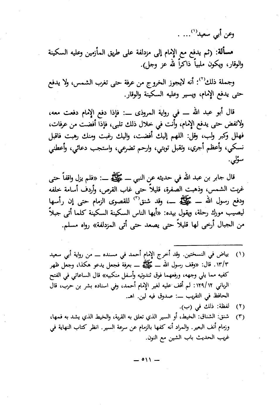 قَالَ جَابِرُ بْنُ عَبْدِ اللَّهِ فِي حَدِيثِهِ عَنِ النَّبِيِّ - صَلَّى اللَّهُ عَلَيْهِ وَسَلَّمَ -: " «فَلَمْ يَزَلْ وَاقِفًا حَتَّى غَرَبَتِ الشَّمْسُ، وَذَهَبَتِ الصُّفْرَةُ قَلِيلًا حَتَّى غَابَ الْقُرْصُ، وَأَرْدَفَ أُسَامَةَ خَلْفَهُ، وَدَفَعَ رَسُولُ اللَّهِ - صَلَّى اللَّهُ عَلَيْهِ وَسَلَّمَ -، وَقَدْ شَنَقَ لِلْقَصْوَى الزِّمَامَ حَتَّى إِنَّ رَأْسَهَا لَيُصِيبُ مَوْرِكَ رَحْلِهِ، وَيَقُولُ بِيَدِهِ: " أَيُّهَا النَّاسُ، السَّكِينَةَ السَّكِينَةَ، كُلَّمَا أَتَى جَبَلًا مِنَ الْجِبَالِ أَرْخَى لَهَا قَلِيلًا حَتَّى يَصْعَدَ، حَتَّى أَتَى الْمُزْدَلِفَةَ» ". رَوَاهُ مُسْلِمٌ.