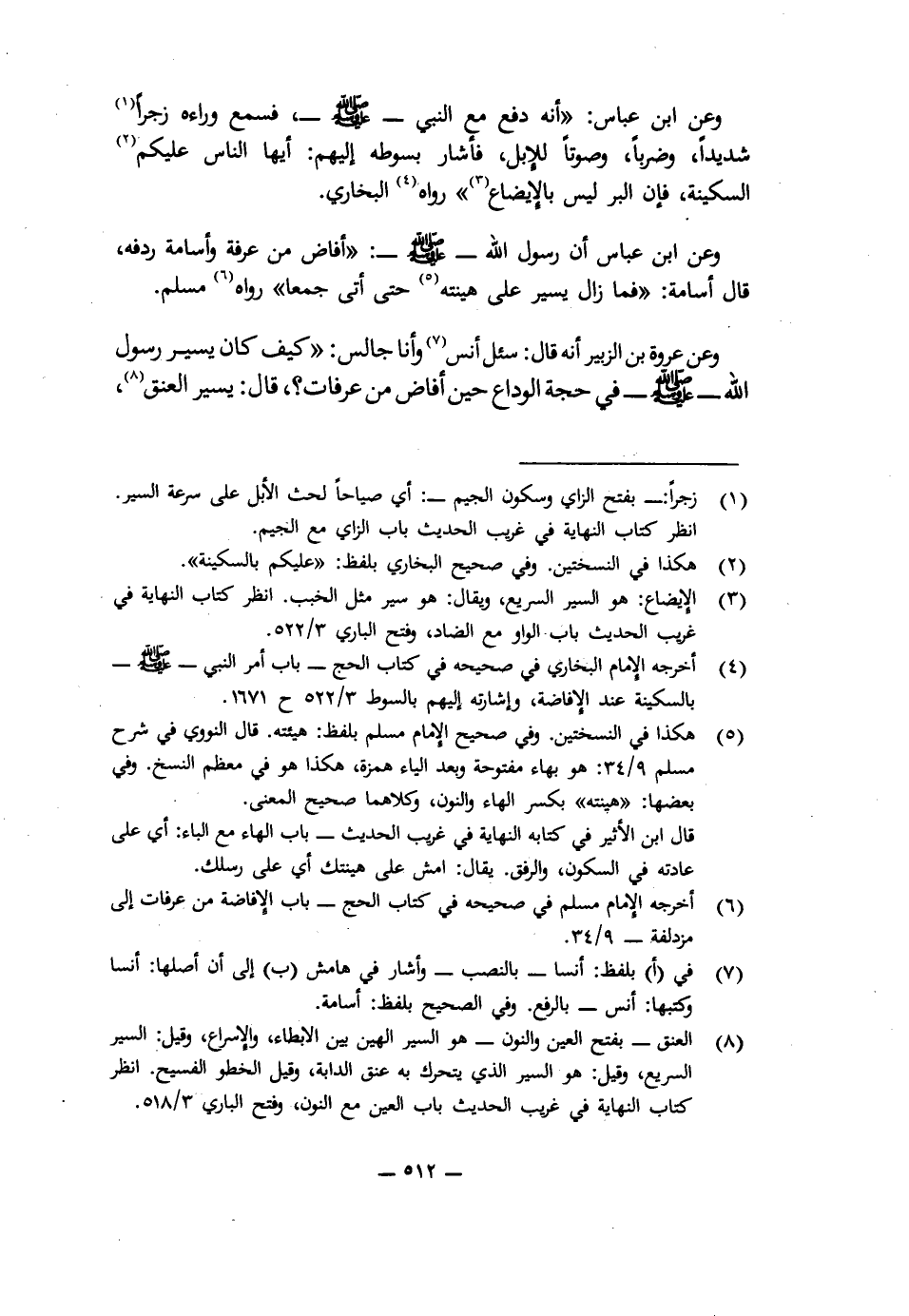 وَعَنِ ابْنِ عَبَّاسٍ: " «أَنَّهُ دَفَعَ مَعَ النَّبِيِّ - صَلَّى اللَّهُ عَلَيْهِ وَسَلَّمَ - فَسَمِعَ وَرَاءَهُ زَجْرًا شَدِيدًا، وَضَرْبًا، وَصَوْتًا لِلْإِبِلِ، فَأَشَارَ بِسَوْطِهِ إِلَيْهِمْ: أَيُّهَا النَّاسُ عَلَيْكُمُ بِالسَّكِينَةِ، فَإِنَّ الْبِرَّ لَيْسَ بِالْإِيضَاعِ» ". رَوَاهُ الْبُخَارِيُّ.