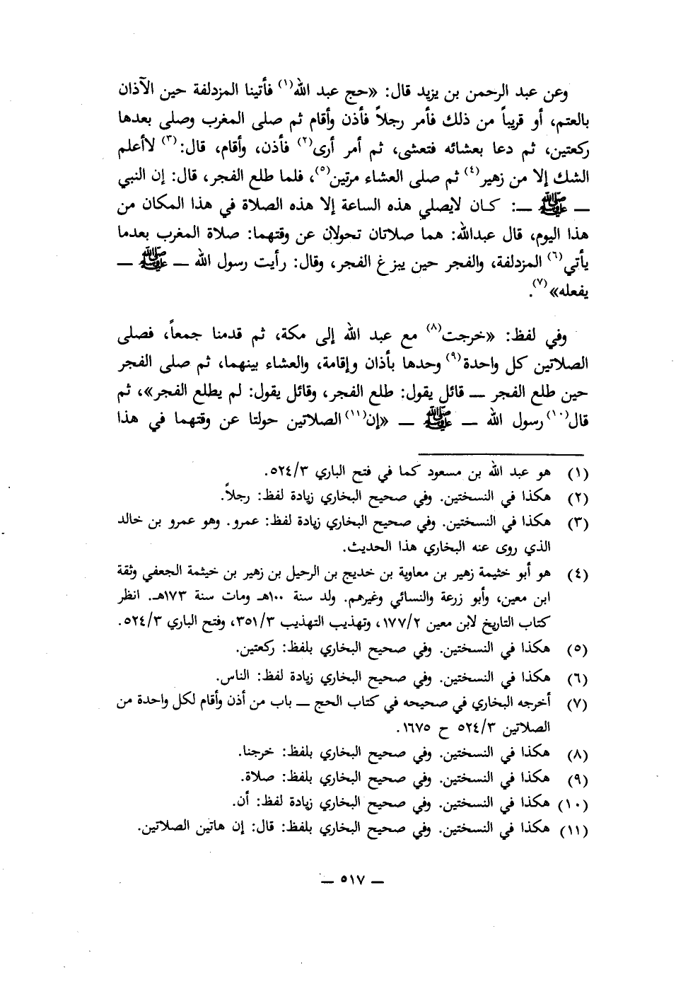 وَعَنْ عَبْدِ الرَّحْمَنِ بْنِ يَزِيدَ قَالَ: " «حَجَّ عَبْدُ اللَّهِ فَأَتَيْنَا الْمُزْدَلِفَةَ حِينَ الْأَذَانِ بِالْعَتَمِ، أَوْ قَرِيبًا مِنْ ذَلِكَ فَأَمَرَ رَجُلًا فَأَذَّنَ وَأَقَامَ، ثُمَّ صَلَّى الْمَغْرِبَ، وَصَلَّى بَعْدَهَا رَكْعَتَيْنِ، ثُمَّ دَعَا بِعَشَائِهِ فَتَعَشَّى، ثُمَّ أَمَرَ أَرَى فَأَذَّنَ، وَأَقَامَ، قَالَ: لَا أَعْلَمُ الشَّكَّ إِلَّا مِنْ زُهَيْرٍ، ثُمَّ صَلَّى الْعِشَاءَ مَرَّتَيْنِ، فَلَمَّا طَلَعَ الْفَجْرُ، قَالَ: إِنَّ النَّبِيَّ - صَلَّى اللَّهُ عَلَيْهِ وَسَلَّمَ -: كَانَ لَا يُصَلِّي هَذِهِ السَّاعَةَ إِلَّا هَذِهِ الصَّلَاةَ فِي هَذَا الْمَكَانِ مِنْ هَذَا الْيَوْمِ، قَالَ عَبْدُ اللَّهِ: هُمَا صَلَاتَانِ تُحَوَّلَانِ عَنْ وَقْتِهِمَا: صَلَاةُ الْمَغْرِبِ بَعْدَمَا يَأْتِي الْمُزْدَلِفَةَ، وَالْفَجْرِ حِينَ يَبْزُغُ الْفَجْرُ، وَقَالَ: رَأَيْتُ رَسُولَ اللَّهِ - صَلَّى اللَّهُ عَلَيْهِ وَسَلَّمَ - يَفْعَلُهُ» ".