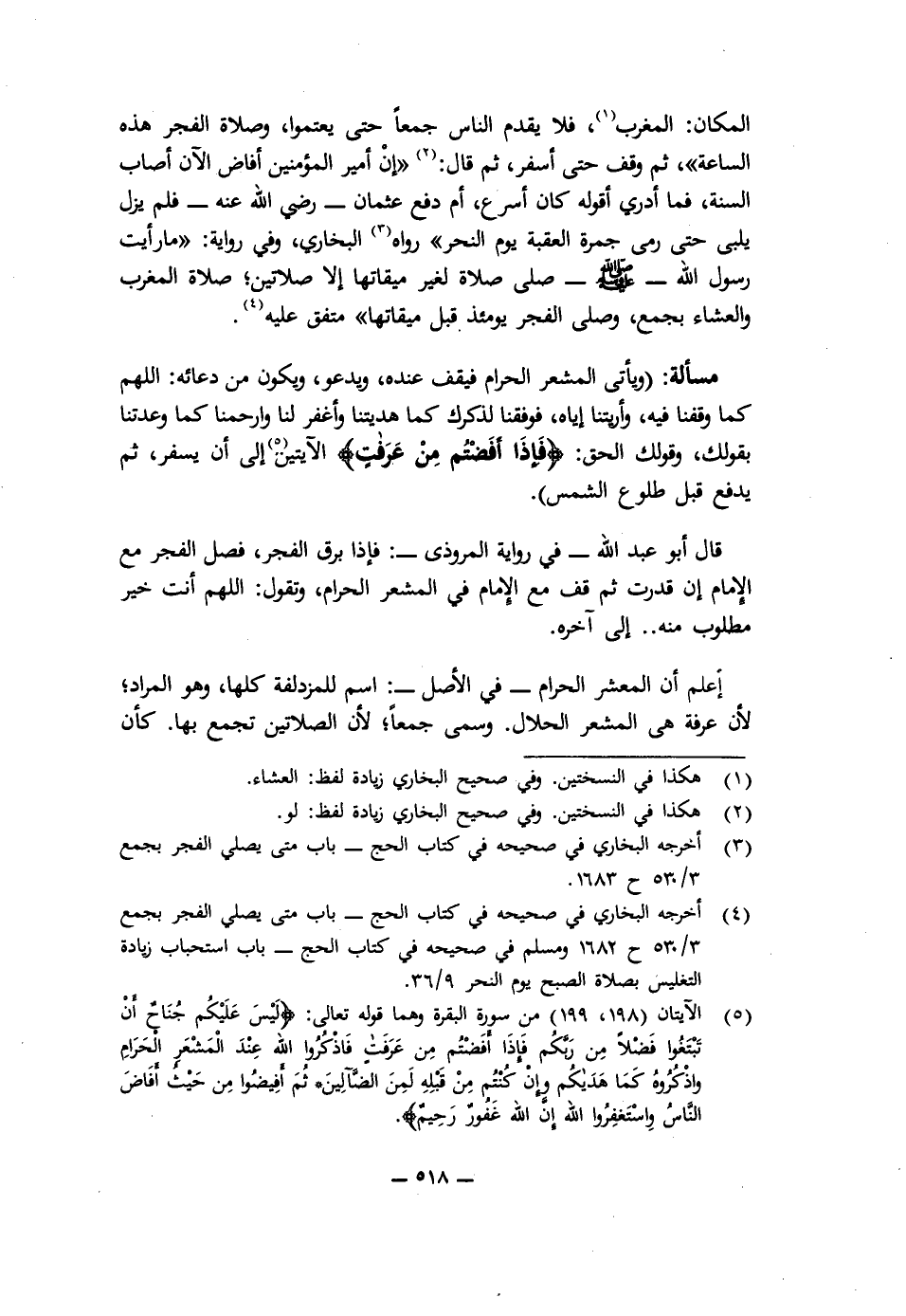 الْمَكَانِ: الْمَغْرِبُ، فَلَا يَقْدَمُ النَّاسُ جَمْعًا حَتَّى يُعْتِمُوا، وَصَلَاةُ الْفَجْرِ هَذِهِ السَّاعَةَ "، ثُمَّ وَقَفَ حَتَّى أَسْفَرَ، ثُمَّ قَالَ: " إِنَّ أَمِيرَ الْمُؤْمِنِينَ أَفَاضَ الْآنَ أَصَابَ السُّنَّةَ، فَمَا أَدْرِي أَقَوْلُهُ كَانَ أَسْرَعَ؟ أَمْ دَفْعُ عُثْمَانَ - رَضِيَ اللَّهُ عَنْهُ - فَلَمْ يَزَلْ يُلَبِّي حَتَّى رَمَى جَمْرَةَ الْعَقَبَةِ يَوْمَ النَّحْرِ». رَوَاهُ الْبُخَارِيُّ، وَفِي رِوَايَةٍ: " «مَا رَأَيْتُ رَسُولَ اللَّهِ - صَلَّى اللَّهُ عَلَيْهِ وَسَلَّمَ - صَلَّى صَلَاةً لِغَيْرِ مِيقَاتِهَا إِلَّا صَلَاتَيْنِ ; صَلَاةَ الْمَغْرِبِ وَالْعِشَاءِ بِجَمْعٍ، وَصَلَّى الْفَجْرَ يَوْمَئِذٍ قَبْلَ مِيقَاتِهَا» ". مُتَّفَقٌ عَلَيْهِ.