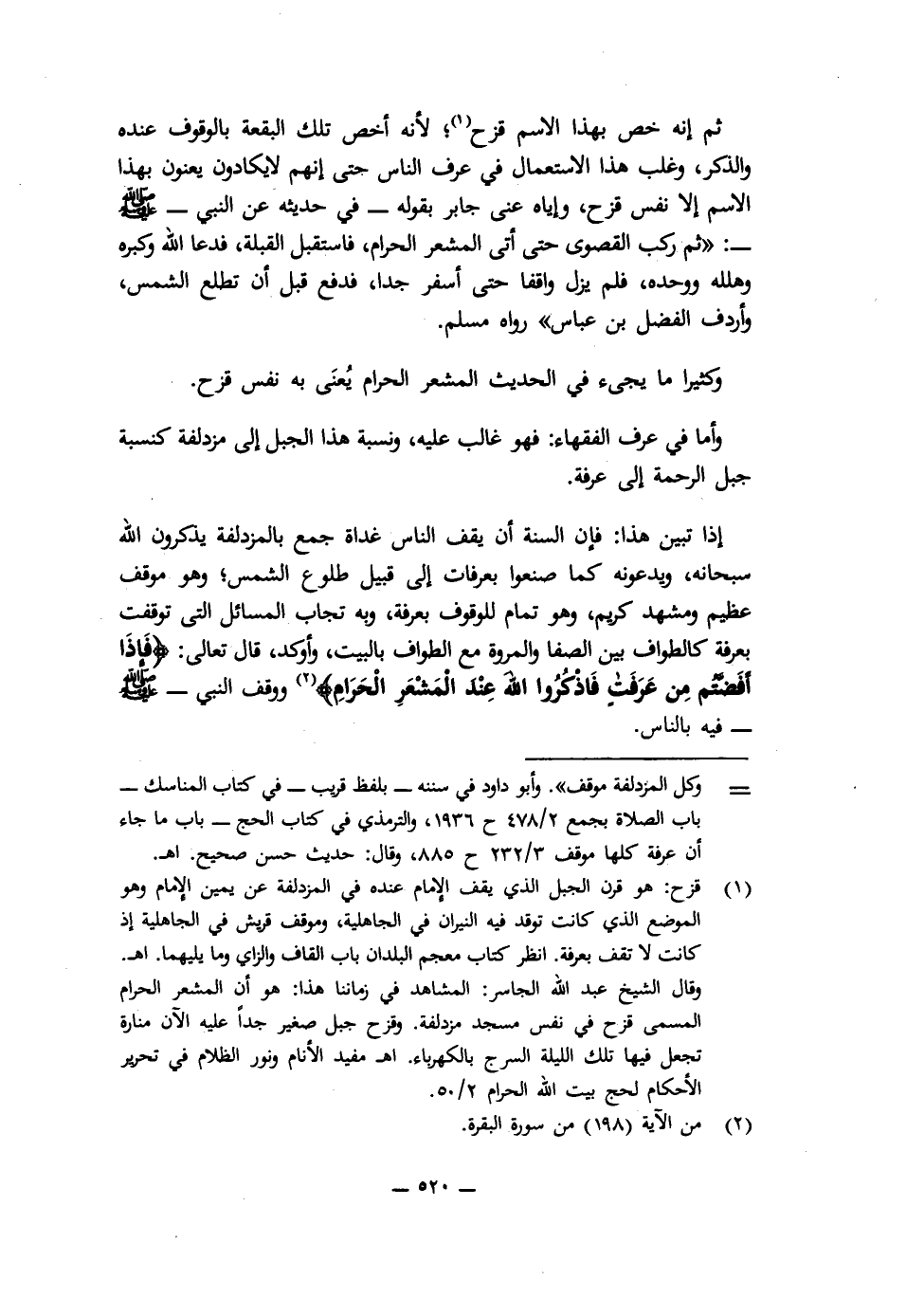 ثُمَّ إِنَّهُ خَصَّ بِهَذَا الِاسْمِ قُزَحَ ; لِأَنَّهُ أَخَصُّ تِلْكَ الْبُقْعَةِ بِالْوُقُوفِ عِنْدَهُ وَالذِّكْرِ، وَغَلَبَ هَذَا الِاسْتِعْمَالُ فِي عُرْفِ النَّاسِ حَتَّى إِنَّهُمْ لَا يَكَادُونَ يَعْنُونَ بِهَذَا الِاسْمِ إِلَّا نَفْسَ قُزَحَ، وَإِيَّاهُ عَنَى جَابِرٌ بِقَوْلِهِ - فِي حَدِيثِهِ عَنِ النَّبِيِّ - صَلَّى اللَّهُ عَلَيْهِ وَسَلَّمَ -: «ثُمَّ رَكِبَ الْقَصْوَى حَتَّى أَتَى الْمَشْعَرَ الْحَرَامَ، فَاسْتَقْبَلَ الْقِبْلَةَ، فَدَعَا اللَّهَ وَكَبَّرَهُ وَهَلَّلَهُ وَوَحَّدَهُ، فَلَمْ يَزَلْ وَاقِفًا حَتَّى أَسْفَرَ جِدًّا، فَدَفَعَ قَبْلَ أَنْ تَطْلُعَ الشَّمْسُ، وَأَرْدَفَ الْفَضْلَ بْنَ عَبَّاسٍ». رَوَاهُ مُسْلِمٌ.