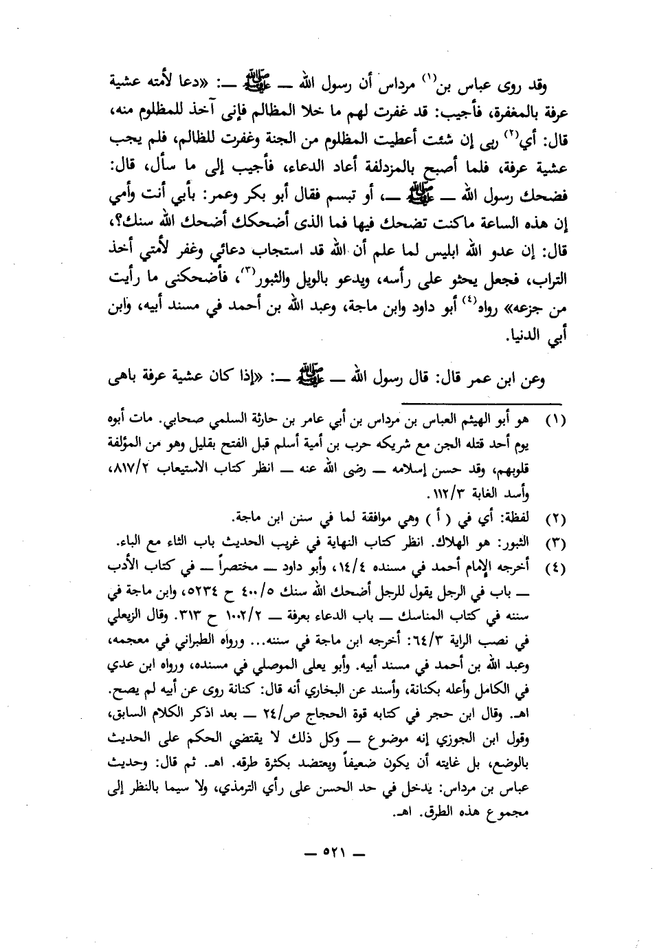 وَقَدْ رَوَى عَبَّاسُ بْنُ مِرْدَاسٍ «أَنَّ رَسُولَ اللَّهِ - صَلَّى اللَّهُ عَلَيْهِ وَسَلَّمَ -: " دَعَا لِأُمَّتِهِ عَشِيَّةَ عَرَفَةَ بِالْمَغْفِرَةِ، فَأُجِيبَ: قَدْ غَفَرْتُ لَهُمْ مَا خَلَا الْمَظَالِمَ، فَإِنِّي آخُذُ لِلْمَظْلُومِ مِنْهُ، قَالَ: أَيْ رَبِّي إِنْ شِئْتَ أَعْطَيْتَ الْمَظْلُومَ مِنَ الْجَنَّةِ وَغَفَرْتَ لِلظَّالِمِ، فَلَمْ يُجَبْ عَشِيَّةَ عَرَفَةَ، فَلَمَّا أَصْبَحَ بِالْمُزْدَلِفَةِ أَعَادَ الدُّعَاءَ فَأُجِيبُ إِلَى مَا سَأَلَ، قَالَ: فَضَحِكَ رَسُولُ اللَّهِ - صَلَّى اللَّهُ عَلَيْهِ وَسَلَّمَ - أَوْ تَبَسَّمَ، فَقَالَ أَبُو بَكْرٍ وَعُمَرُ: بِأَبِي أَنْتَ وَأُمِّي إِنَّ هَذِهِ السَّاعَةَ مَا كُنْتَ تَضْحَكُ فِيهَا، فَمَا الَّذِي أَضْحَكَكَ، أَضْحَكَ اللَّهُ سِنَّكَ؟ قَالَ: إِنَّ عَدُوَّ اللَّهِ إِبْلِيسَ لَمَّا عَلِمَ أَنَّ اللَّهَ قَدِ اسْتَجَابَ دُعَائِي وَغَفَرَ لِأُمَّتِي أَخَذَ التُّرَابَ، فَجَعَلَ يَحْثُو عَلَى رَأْسِهِ، وَيَدْعُو بِالْوَيْلِ وَالثُّبُورِ ; فَأَضْحَكَنِي مَا رَأَيْتُ مِنْ جَزَعِهِ». رَوَاهُ أَبُو دَاوُدَ، وَابْنُ مَاجَهْ، وَعَبْدُ اللَّهِ بْنُ أَحْمَدَ فِيُ مُسْنَدِ أَبِيهِ، وَابْنُ أَبِي الدُّنْيَا.