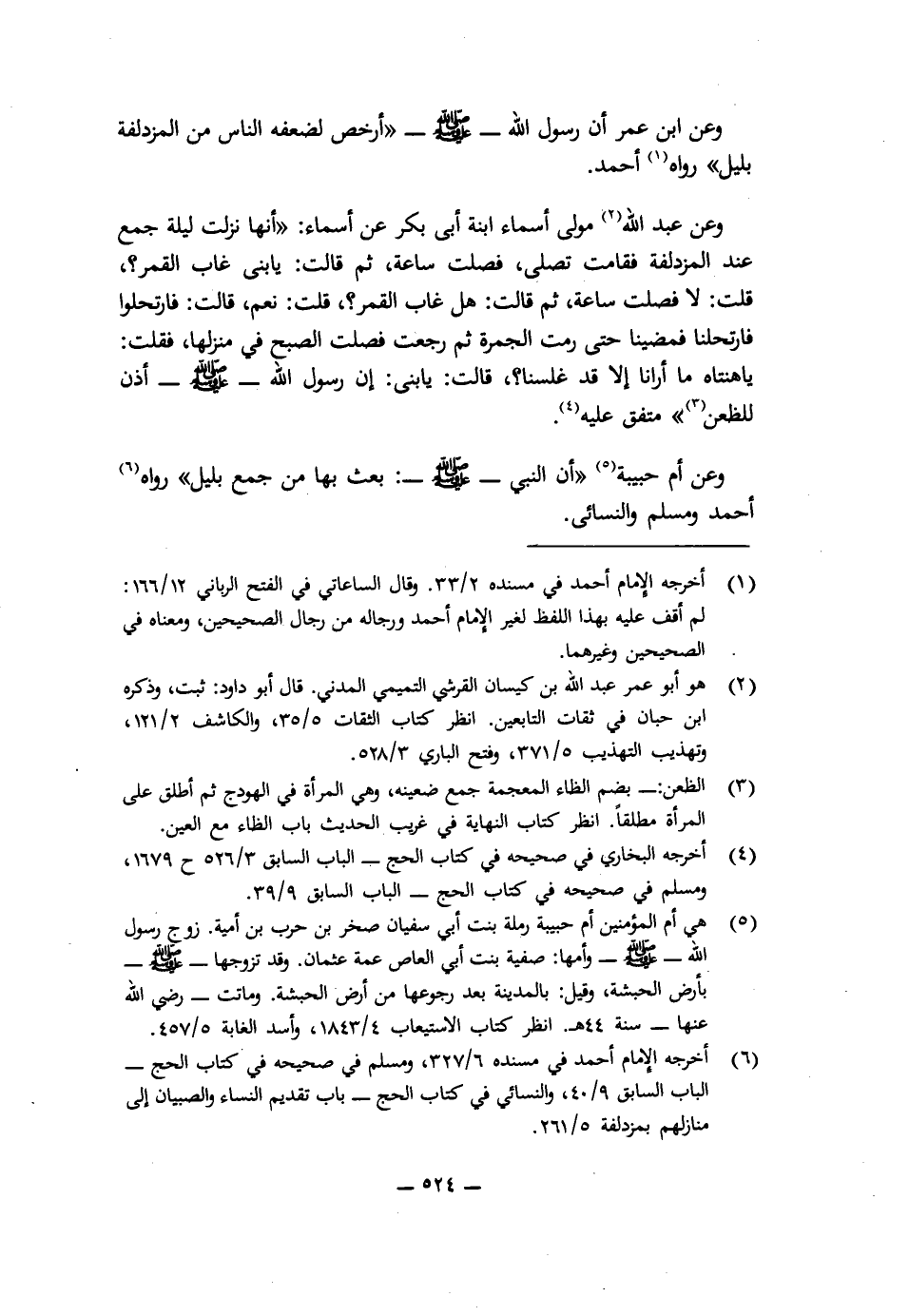 وَعَنْ عَبْدِ اللَّهِ مَوْلَى أَسْمَاءَ ابْنَةِ أَبِي بَكْرٍ «عَنْ أَسْمَاءَ: " أَنَّهَا نَزَلَتْ لَيْلَةَ جَمْعٍ عِنْدَ الْمُزْدَلِفَةِ فَقَامَتْ تُصَلِّي، فَصَلَّتْ سَاعَةً، ثُمَّ قَالَتْ: يَا بُنَيَّ غَابَ الْقَمَرُ؟ قُلْتُ: لَا، فَصَلَّتْ سَاعَةً، ثُمَّ قَالَتْ: هَلْ غَابَ الْقَمَرُ؟ قُلْتُ: نَعَمْ، قَالَتْ: فَارْتَحِلُوا فَارْتَحَلْنَا، فَمَضَيْنَا حَتَّى رَمَتِ الْجَمْرَةَ، ثُمَّ رَجَعَتْ فَصَلَّتِ الصُّبْحَ فِي مَنْزِلِهَا، فَقُلْتُ: يَا هَنْتَاهُ مَا أُرَانَا إِلَّا قَدْ غَلَّسْنَا؟ قَالَتْ: يَا بُنَيَّ إِنَّ رَسُولَ اللَّهِ - صَلَّى اللَّهُ عَلَيْهِ وَسَلَّمَ - أَذِنَ لِلظُّعُنِ». مُتَّفَقٌ عَلَيْهِ.