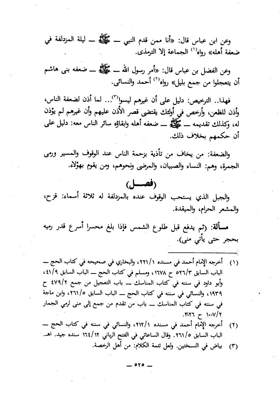 «وَعَنِ ابْنِ عَبَّاسٍ قَالَ: " أَنَا مِمَّنْ قَدَّمَ النَّبِيُّ - صَلَّى اللَّهُ عَلَيْهِ وَسَلَّمَ - لَيْلَةَ الْمُزْدَلِفَةِ فِي ضَعَفَةِ أَهْلِهِ». رَوَاهُ الْجَمَاعَةُ إِلَّا التِّرْمِذِيَّ.