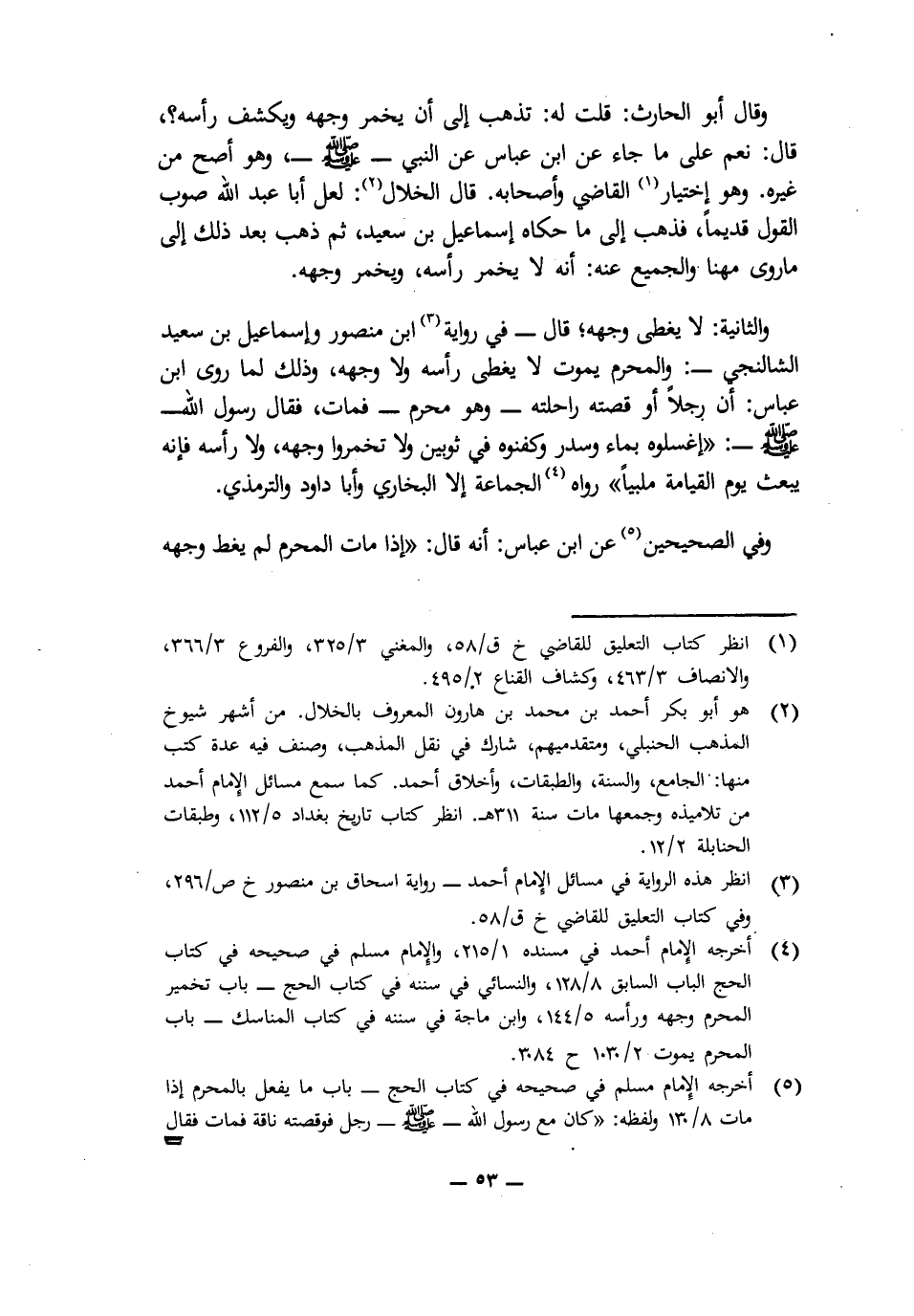 وَقَالَ أَبُو الْحَارِثِ: قُلْتُ لَهُ: تَذْهَبُ إِلَى أَنْ يُخَمَّرُ وَجْهُهُ وَيُكْشَفُ رَأْسُهُ؟ قَالَ: نَعَمْ عَلَى مَا جَاءَ عَنِ ابْنِ عَبَّاسٍ عَنِ النَّبِيِّ - صَلَّى اللَّهُ عَلَيْهِ وَسَلَّمَ - وَهُوَ أَصَحُّ مِنْ غَيْرِهِ وَهُوَ اخْتِيَارُ الْقَاضِي وَأَصْحَابِهِ. قَالَ الْخَلَّالُ: لَعَلَّ أَبَا عَبْدِ اللَّهِ صَوَّبَ الْقَوْلَ قَدِيمًا، فَذَهَبَ إِلَى مَا حَكَاهُ إِسْمَاعِيلُ بْنُ سَعِيدٍ، ثُمَّ ذَهَبَ بَعْدَ ذَلِكَ إِلَى مَا رَوَى مُهَنَّا وَالْجَمِيعُ عَنْهُ: أَنَّهُ لَا يُخَمَّرُ رَأْسُهُ، وَيُخَمَّرُ وَجْهُهُ.