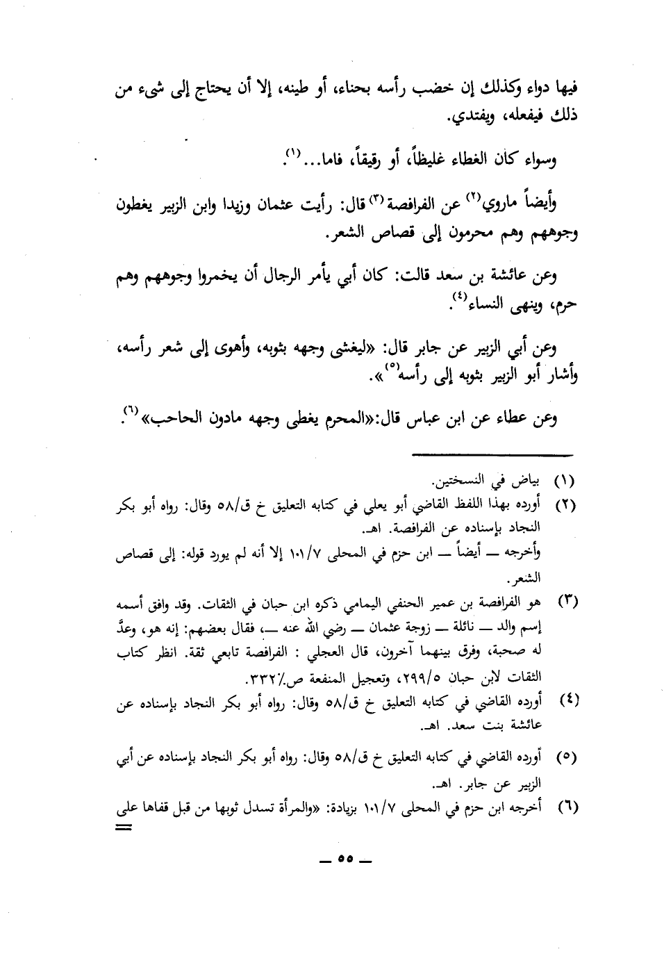 وَأَيْضًا مَا رُوِيَ عَنِ الْفُرَافِصَةِ قَالَ: رَأَيْتُ عُثْمَانَ وَزَيْدًا وَابْنَ الزُّبَيْرِ يُغَطُّونَ وُجُوهَهُمْ وَهُمْ مُحْرِمُونَ إِلَى قُصَاصِ الشَّعْرِ.