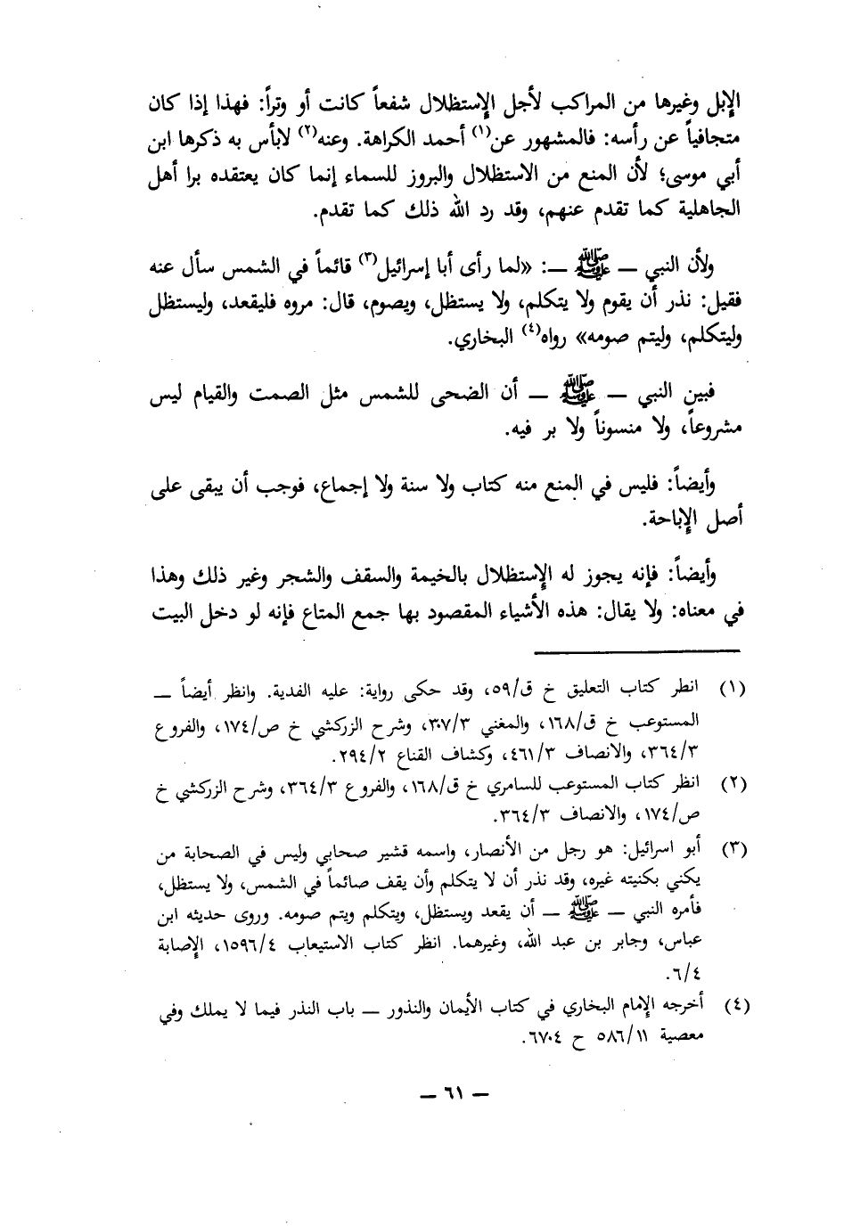 فَبَيَّنَ النَّبِيُّ - صَلَّى اللَّهُ عَلَيْهِ وَسَلَّمَ - أَنَّ الضُّحَى لِلشَّمْسِ مِثْلُ الصَّمْتِ وَالْقِيَامِ لَيْسَ مَشْرُوعًا، وَلَا مَسْنُونًا وَلَا بِرَّ فِيهِ.