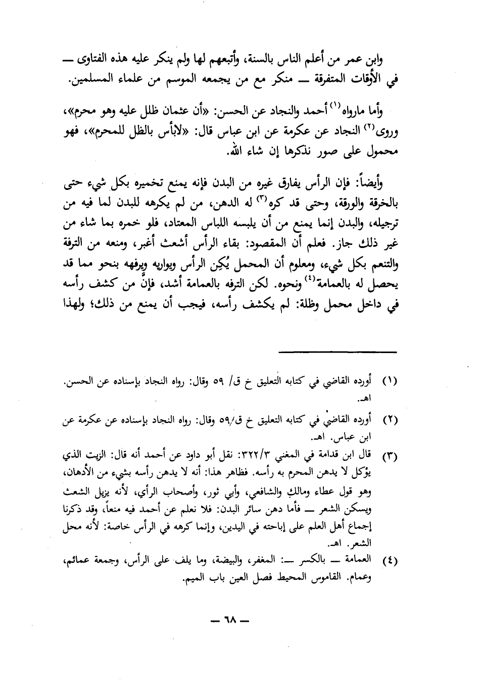 وَأَيْضًا: فَإِنَّ الرَّأْسَ يُفَارِقُ غَيْرَهُ مِنَ الْبَدَنِ فَإِنَّهُ يُمْنَعُ تَخْمِيرُهُ بِكُلِّ شَيْءٍ حَتَّى بِالْخِرْقَةِ وَالْوَرَقَةِ، وَحَتَّى قَدْ كَرِهَ لَهُ الدُّهْنَ، مَنْ لَمْ يَكْرَهْهُ لِلْبَدَنِ لِمَا فِيهِ مِنْ تَرْجِيلِهِ، وَالْبَدَنُ إِنَّمَا يُمْنَعُ مِنْ أَنْ يُلْبِسَهُ اللِّبَاسَ الْمُعْتَادَ، فَلَوْ خَمَّرَهُ بِمَا شَاءَ مِنْ غَيْرِ ذَلِكَ جَازَ. فَعُلِمَ أَنَّ الْمَقْصُودَ: بَقَاءُ الرَّأْسِ أَشْعَثَ أَغْبَرَ، وَمَنْعُهُ مِنَ التَّرَفُّهِ وَالتَّنَعُّمِ بِكُلِّ شَيْءٍ، وَمَعْلُومٌ أَنَّ الْمَحْمِلَ يُكِنُّ الرَّأْسَ وَيُوَارِيهِ وَيُرَفِّهُهُ بِنَحْوِ مِمَّا قَدْ يَحْصُلُ لَهُ بِالْعِمَامَةِ وَنَحْوِهِ. لَكِنَّ التَّرَفُّهَ بِالْعِمَامَةِ أَشَدُّ، فَإِنَّ مَنْ كَشَفَ رَأْسَهُ فِي دَاخِلِ مَحْمِلٍ وَظُلَّةٍ لَمْ يَكْشِفْ رَأْسَهُ، فَيَجِبُ أَنْ يُمْنَعَ مِنْ ذَلِكَ؛ وَلِهَذَا