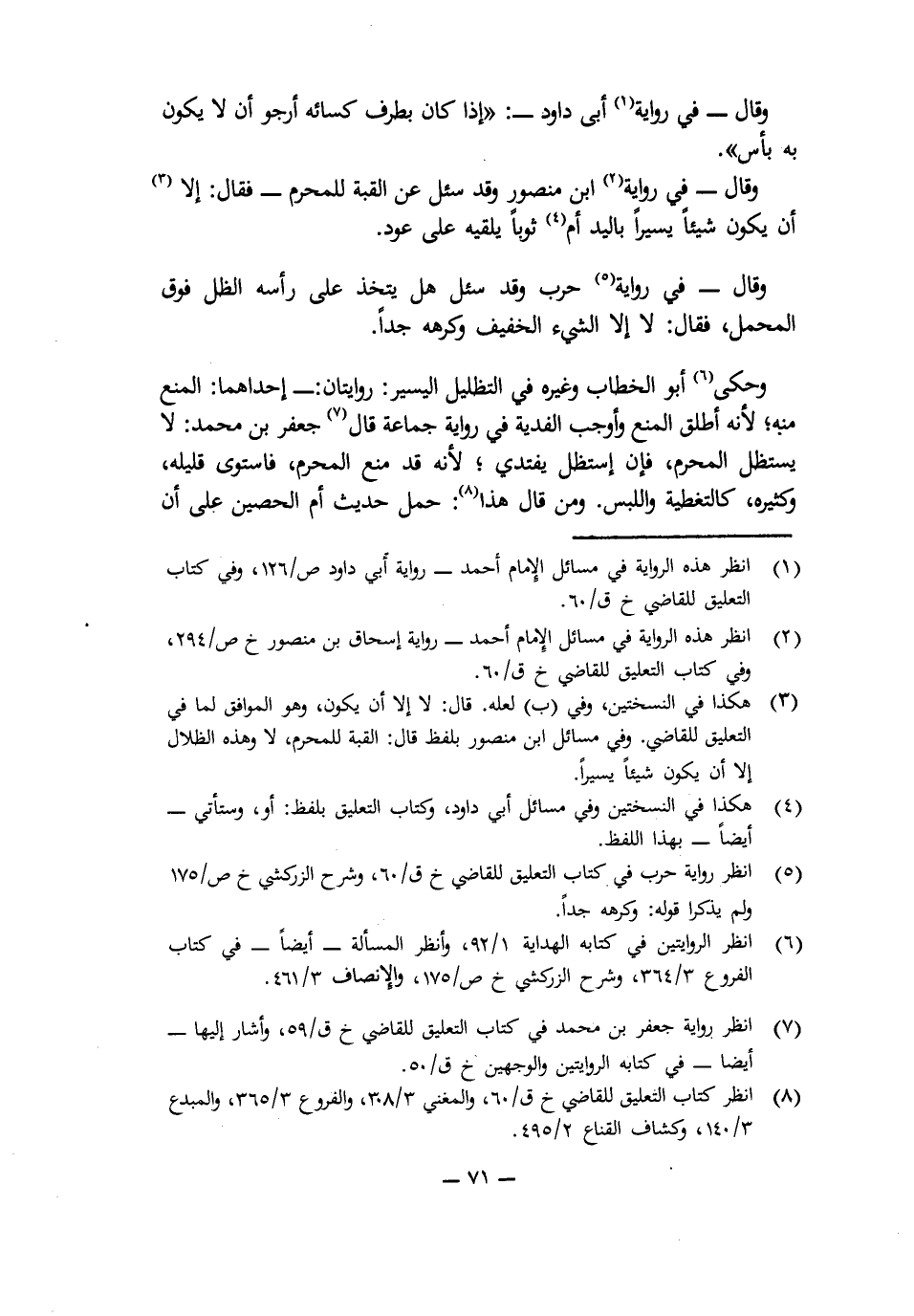 وَحَكَى أَبُو الْخَطَّابِ وَغَيْرُهُ فِي التَّظْلِيلِ الْيَسِيرِ رِوَايَتَيْنِ: إِحْدَاهُمَا: الْمَنْعُ مِنْهُ؛ لِأَنَّهُ أَطْلَقَ الْمَنْعَ وَأَوْجَبَ الْفِدْيَةَ فِي رِوَايَةِ جَمَاعَةٍ، قَالَ جَعْفَرُ بْنُ مُحَمَّدٍ: لَا يَسْتَظِلُّ الْمُحْرِمُ، فَإِنِ اسْتَظَلَّ يَفْتَدِي؛ لِأَنَّهُ قَدْ مَنَعَ الْمُحْرِمَ، فَاسْتَوَى قَلِيلُهُ وَكَثِيرُهُ، كَالتَّغْطِيَةِ وَاللُّبْسِ. وَمَنْ قَالَ هَذَا حَمَلَ حَدِيثَ أُمِّ الْحُصَيْنِ عَلَى أَنَّ