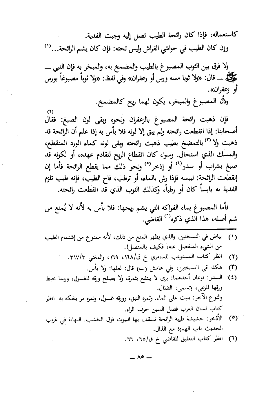 وَلَا فَرْقَ بَيْنَ الثَّوْبِ الْمَصْبُوغِ بِالطِّيبِ وَالْمُضَمَّخِ بِهِ، وَالْمُبَخَّرِ بِهِ فَإِنَّ النَّبِيَّ - صَلَّى اللَّهُ عَلَيْهِ وَسَلَّمَ - قَالَ: " «وَلَا ثَوْبًا مَسَّهُ وَرْسٌ أَوْ زَعْفَرَانٌ» " وَفِي لَفْظٍ: " «وَلَا ثَوْبًا مَصْبُوغًا بِوَرْسٍ أَوْ زَعْفَرَانٍ» ".