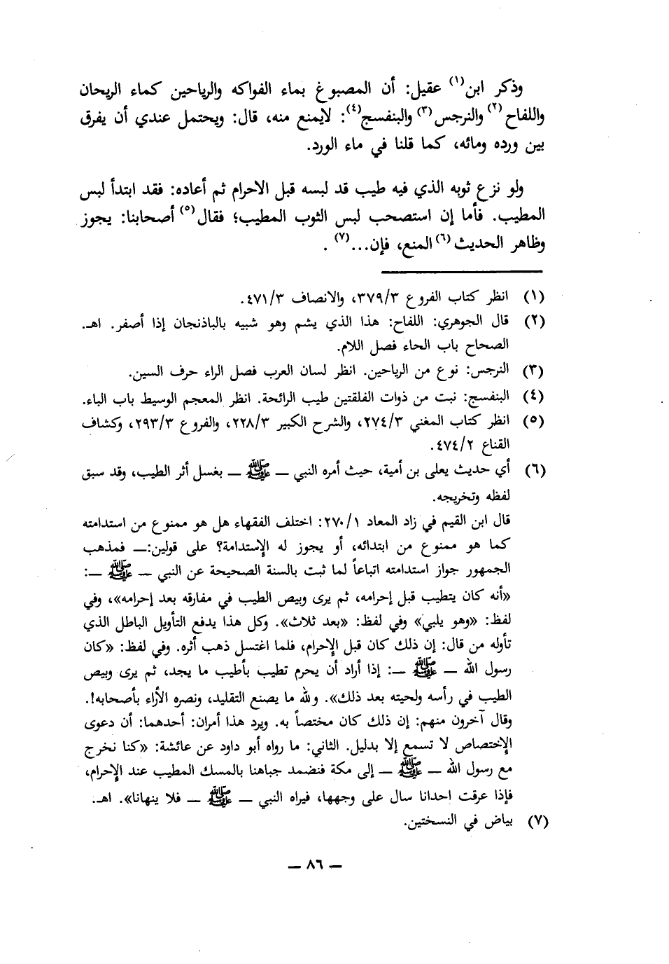 وَلَوْ نَزَعَ ثَوْبَهُ الَّذِي فِيهِ طِيبٌ قَدْ لَبِسَهُ قَبْلَ الْإِحْرَامِ ثُمَّ أَعَادَهُ: فَقَدِ ابْتَدَأَ لُبْسَ الْمُطَيَّبِ. فَأَمَّا إِنِ اسْتَصْحَبَ لُبْسَ الثَّوْبِ الْمُطَيَّبِ فَقَالَ أَصْحَابُنَا: يَجُوزُ، وَظَاهِرُ الْحَدِيثِ الْمَنْعُ فَإِنَّ. . .